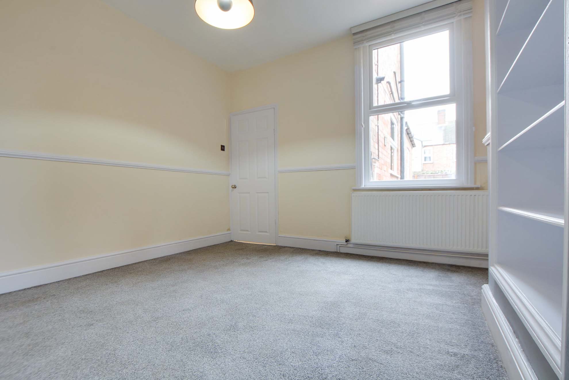 A cosy second reception room featuring soft grey carpeting and a chimney breast with integrated shelving. This practical space includes a dado rail, a radiator, and convenient storage provided by an under stairs cupboard.