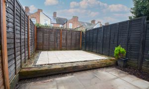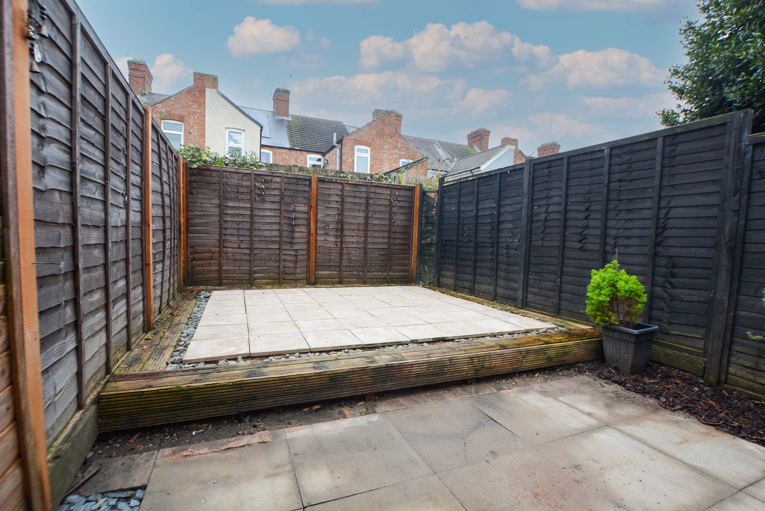 Slabbed patio seating area leading to a raised patio area with well-maintained fence perimeter borders.