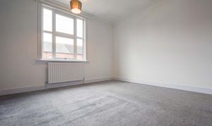 A spacious principal bedroom decorated with a feature chimney breast and two stylish grey alcoves. The room is finished with comfortable grey carpeting, coving to the ceiling, and a radiator.