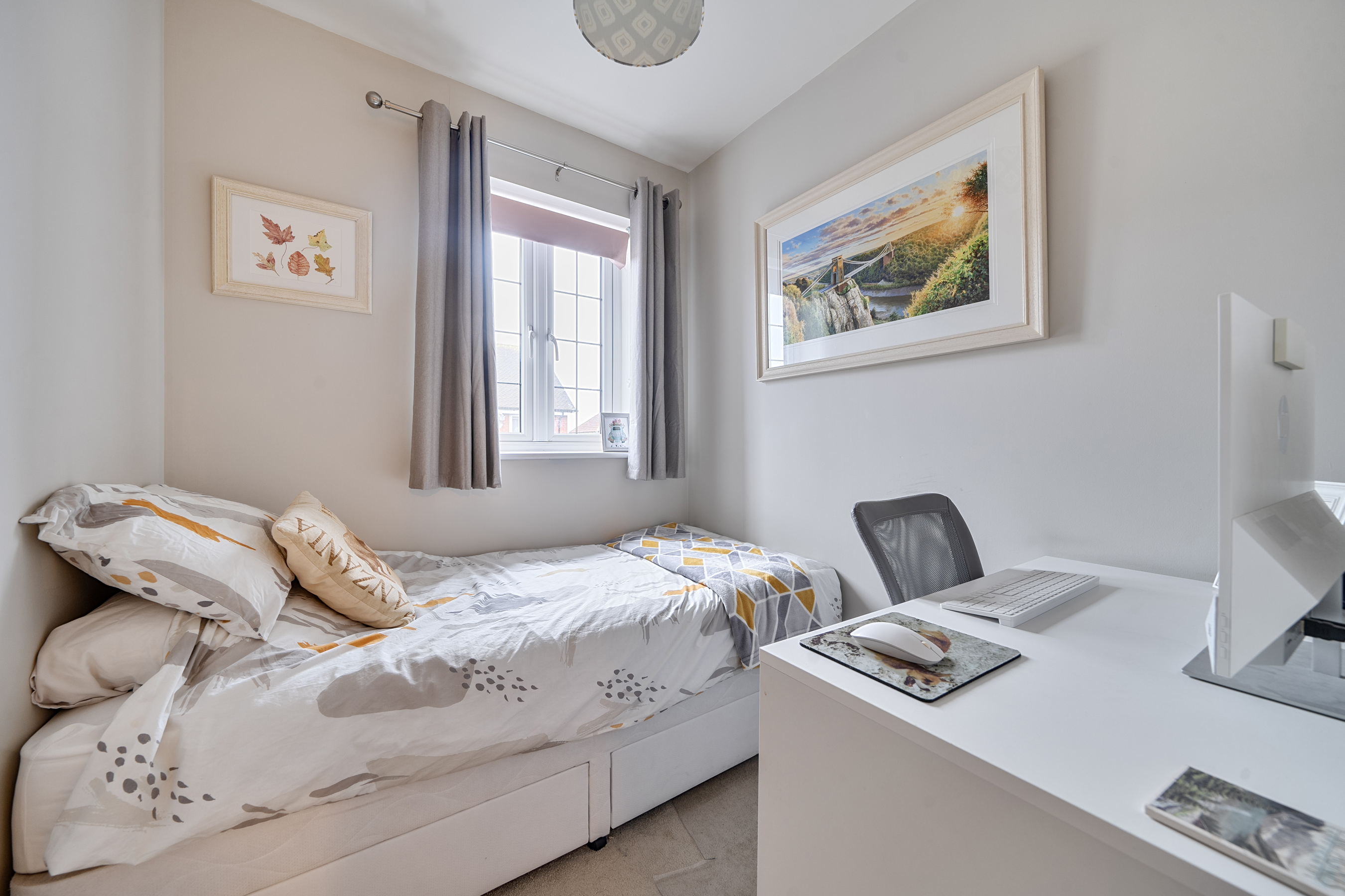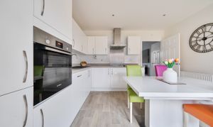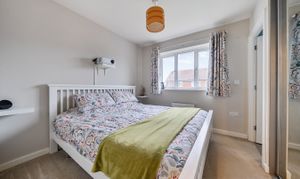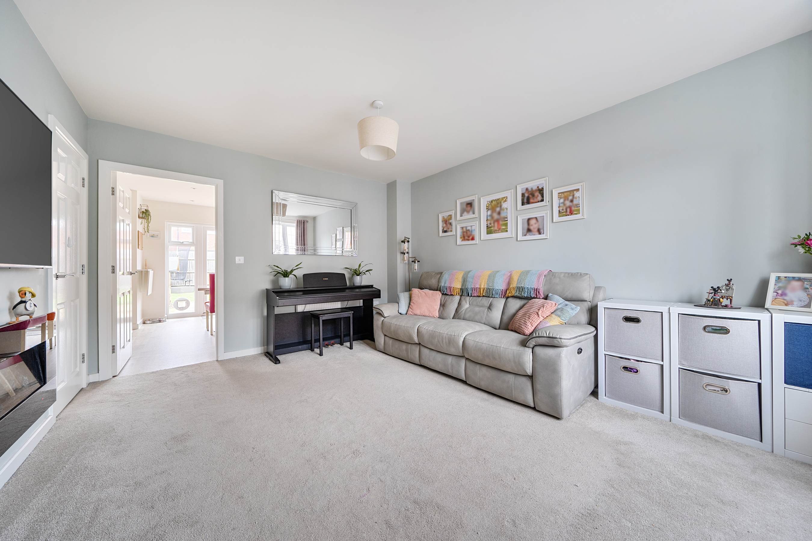 On the first floor, the principal bedroom benefits from built-in mirrored wardrobes and an en-suite shower room. Two further bedrooms are served by a contemporary family bathroom, making the layout versatile and ideal for families.