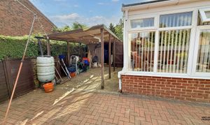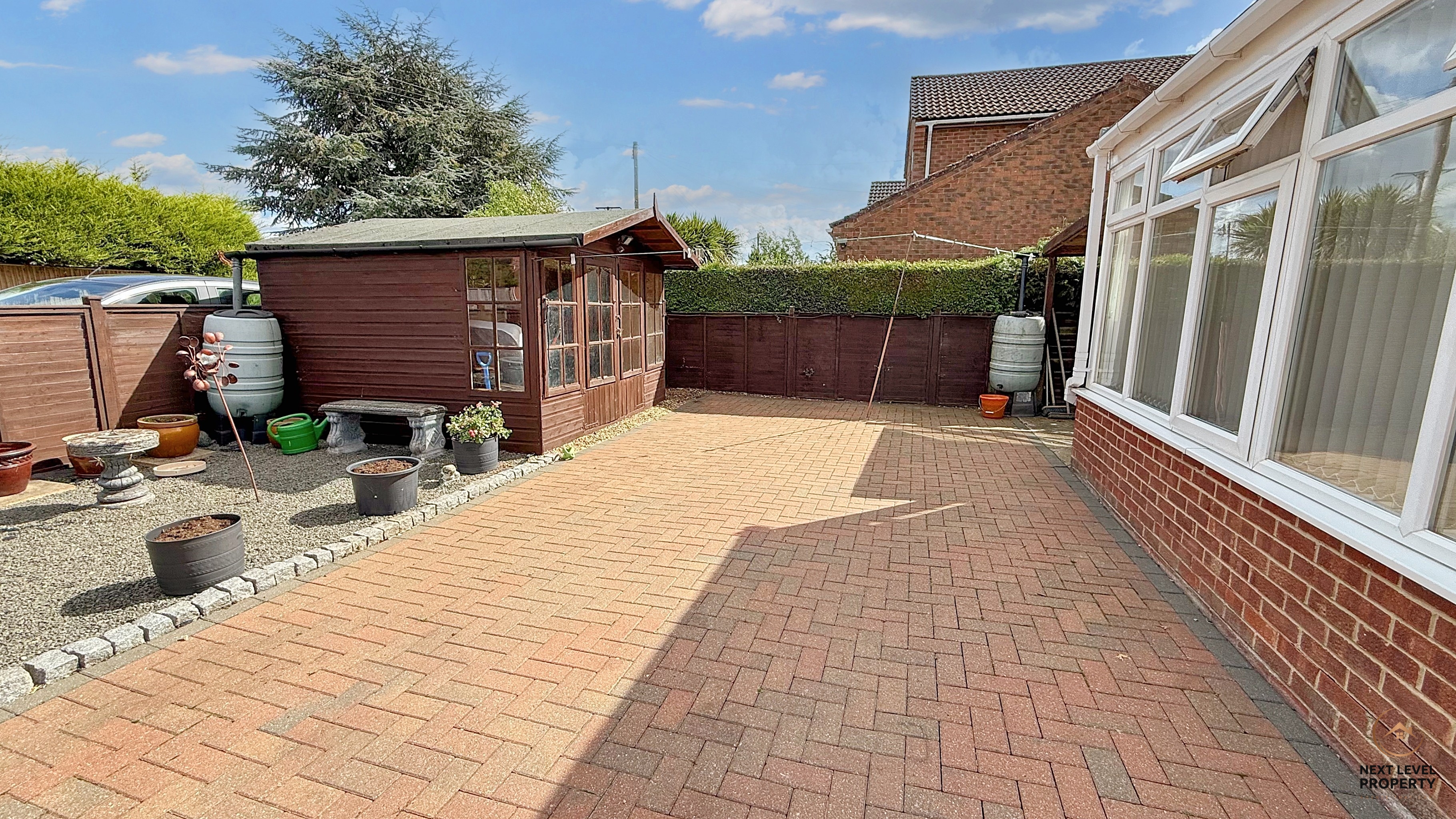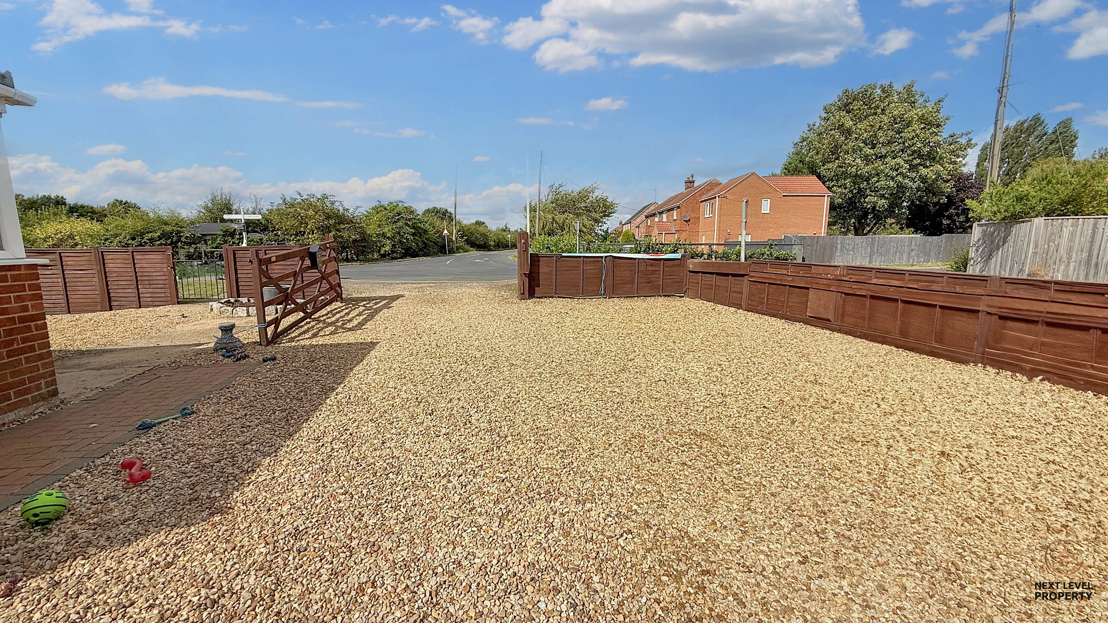 The bungalow sits proudly on a corner plot, with a spacious gravelled frontage providing ample off-road parking, all accessed via a traditional five-bar timber gate. To the side, a block-paved garden area is home to a charming summerhouse — perfect for relaxing or hobbies — while at the rear you’ll find a practical carport and a timber garden shed, offering plenty of storage and versatility