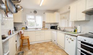 The kitchen is fitted with a good range of cupboards and tall larder units, giving plenty of storage space, along with display shelving for a personal touch. A stainless steel sink is set into the worktop, with tiled splashbacks for easy upkeep. There’s room for both a washing machine and dishwasher, while uPVC windows to the front and side fill the room with natural light. The vinyl flooring is practical underfoot, making this a welcoming and functional heart of the home