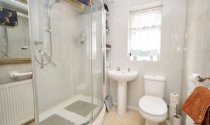 The shower room is fitted with a generous double shower cubicle, along with a pedestal hand basin and close-coupled WC. A radiator provides warmth, while the walls combine tiling and wet board for a smart, practical finish. A uPVC double-glazed window to the side brings in natural light