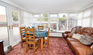 This versatile conservatory/dining room is surrounded by uPVC double-glazed windows set over a half-brick base, filling the space with natural light. French doors open straight out to the garden, while the insulated solid roof makes it a comfortable room to enjoy all year round, whether for family meals, entertaining, or simply relaxing