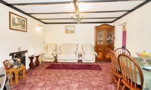 The lounge is a cosy space with a feature fireplace ready for an electric fire, complemented by charming mock timber beams. A radiator keeps the room snug, while an open archway flows through to the conservatory/dining room, creating a lovely sense of space and light