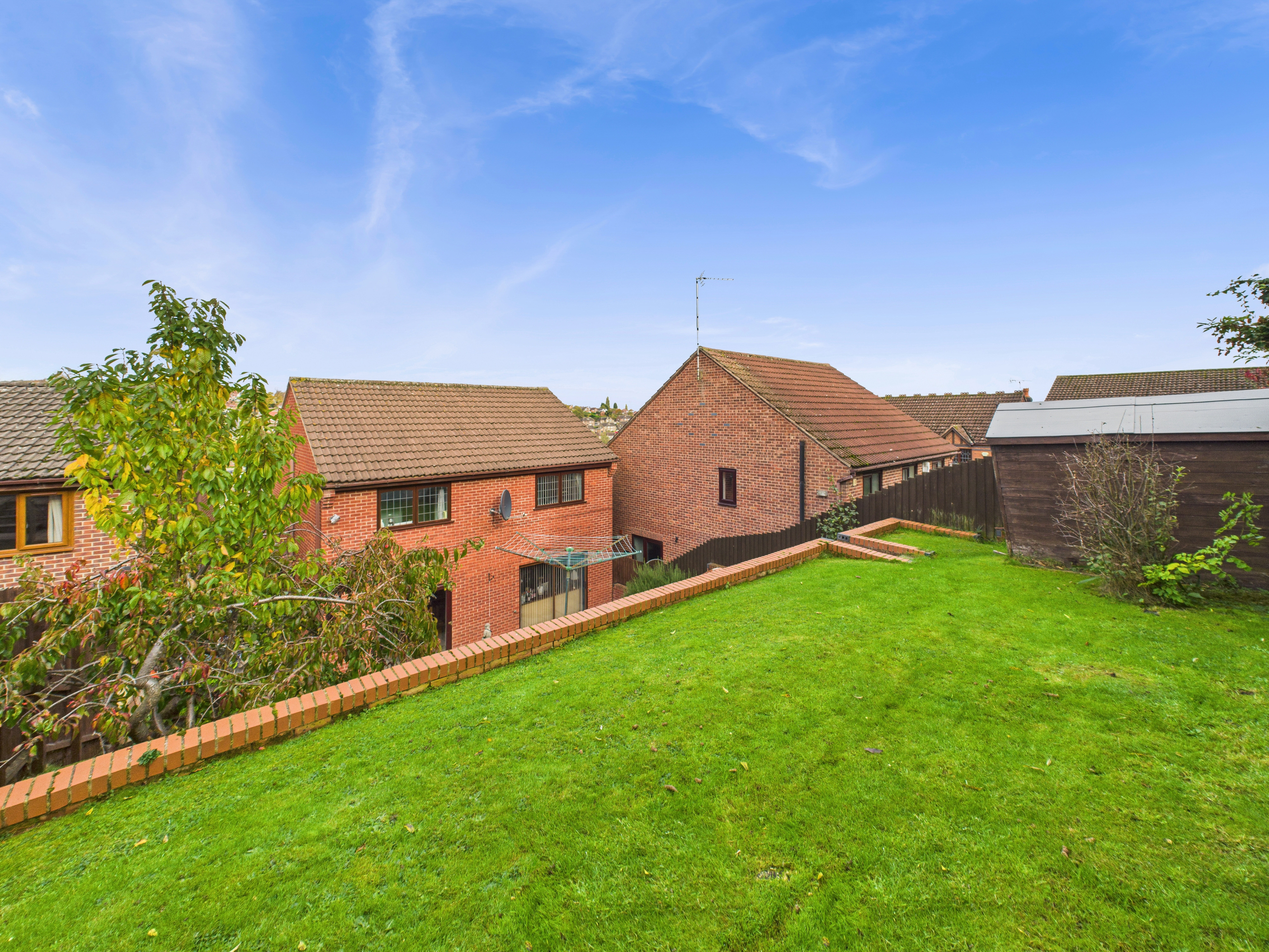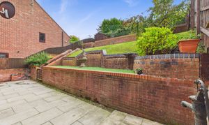Outside, the southerly facing rear garden offers a tiered layout with a paved patio featuring a decorative water pump with a brick-built arch surround. The garden also includes a useful garden shed providing ample storage.