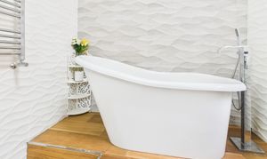 - Stylish family bathroom with freestanding slipper-style bath and vanity basin with built-in storage