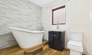 Upstairs, the landing provides access to a partially boarded loft. There are four bedrooms, with the principal bedroom benefitting from an ensuite shower room comprising a traditional sink, WC and shower enclosure with an electric shower. The family bathroom is a standout feature, complete with a freestanding slipper-style bath with stand-alone mixer taps, a vanity basin with built-in storage, towel radiator and tiled flooring.
