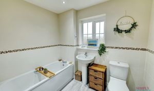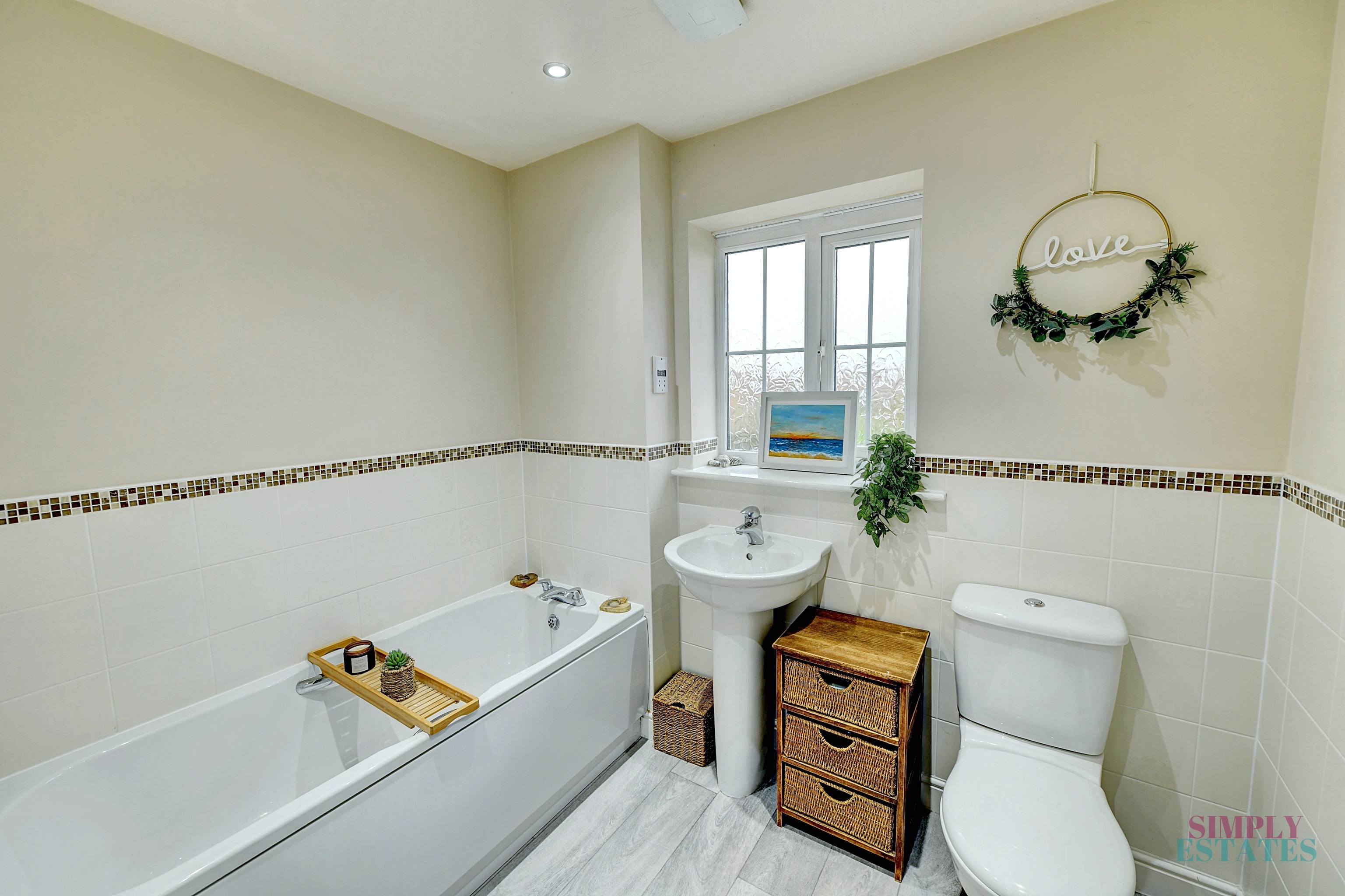 The family bathroom features a classic three-piece suite, including a bath, a pedestal wash basin and a modern WC. Neutrally decorated, this space provides a clean and timeless finish.