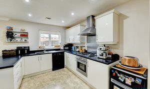 The dining room transitions seamlessly from the kitchen, providing a natural connection between cooking and dining areas. This adaptable space offers plenty of room for a dining table and chairs and connects the open-plan layout to a spacious conservatory, perfect for additional living or entertaining.