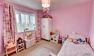 The second bedroom is a well-proportioned space, featuring a front-facing window that lets in plenty of natural light. Currently used as a children's bedroom, it is painted in a soft pink and finished with a neutral beige carpet.