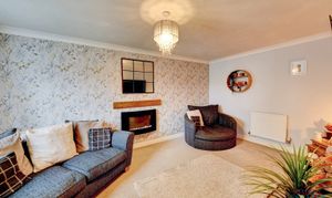 This inviting lounge boasts a large front-facing window that fills the space with natural light. A stylish wall-mounted electric fire serves as a focal point, adding both charm and comfort to the room. Perfect for relaxing or entertaining, this lounge offers a cosy yet modern living space.