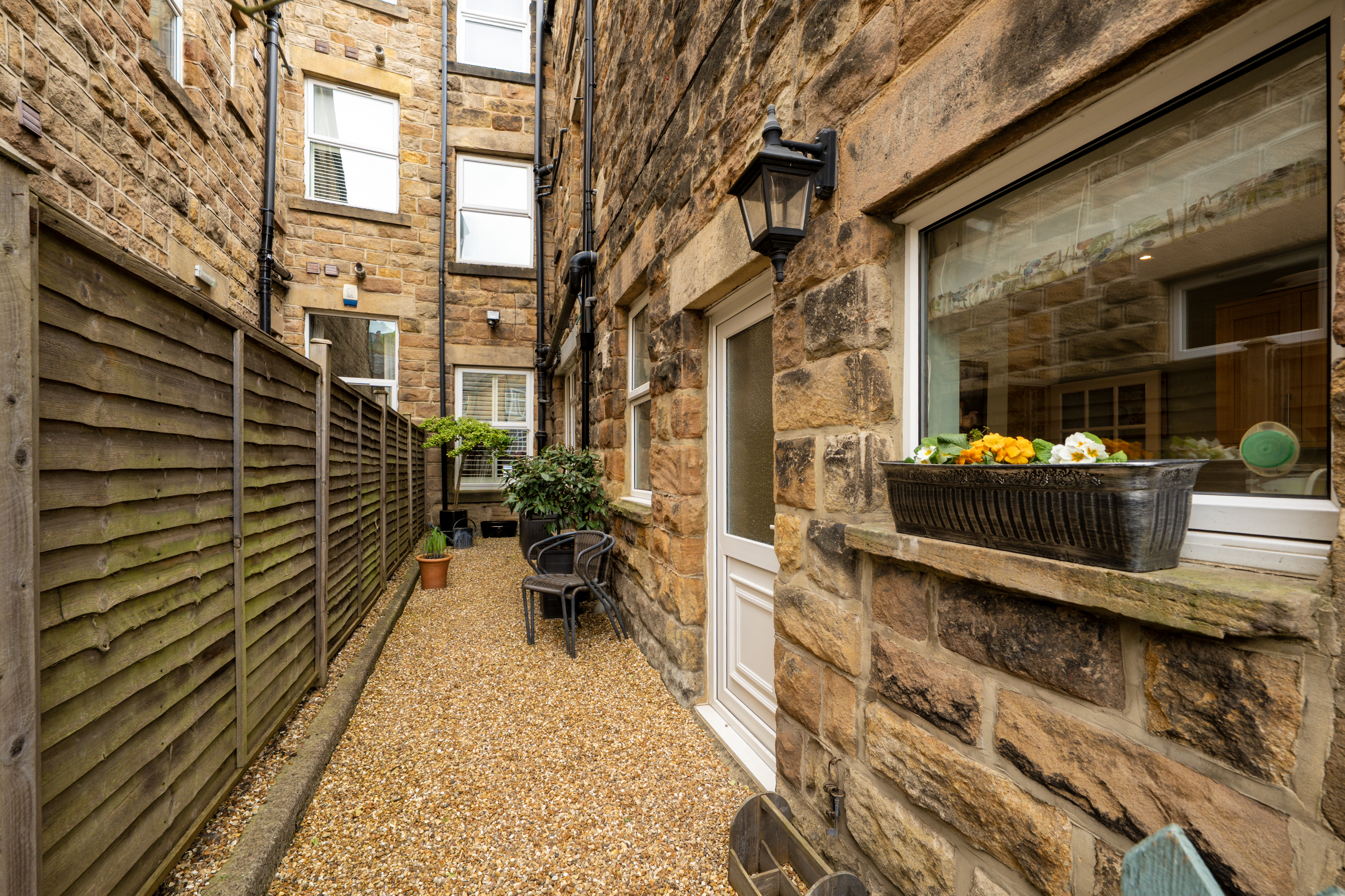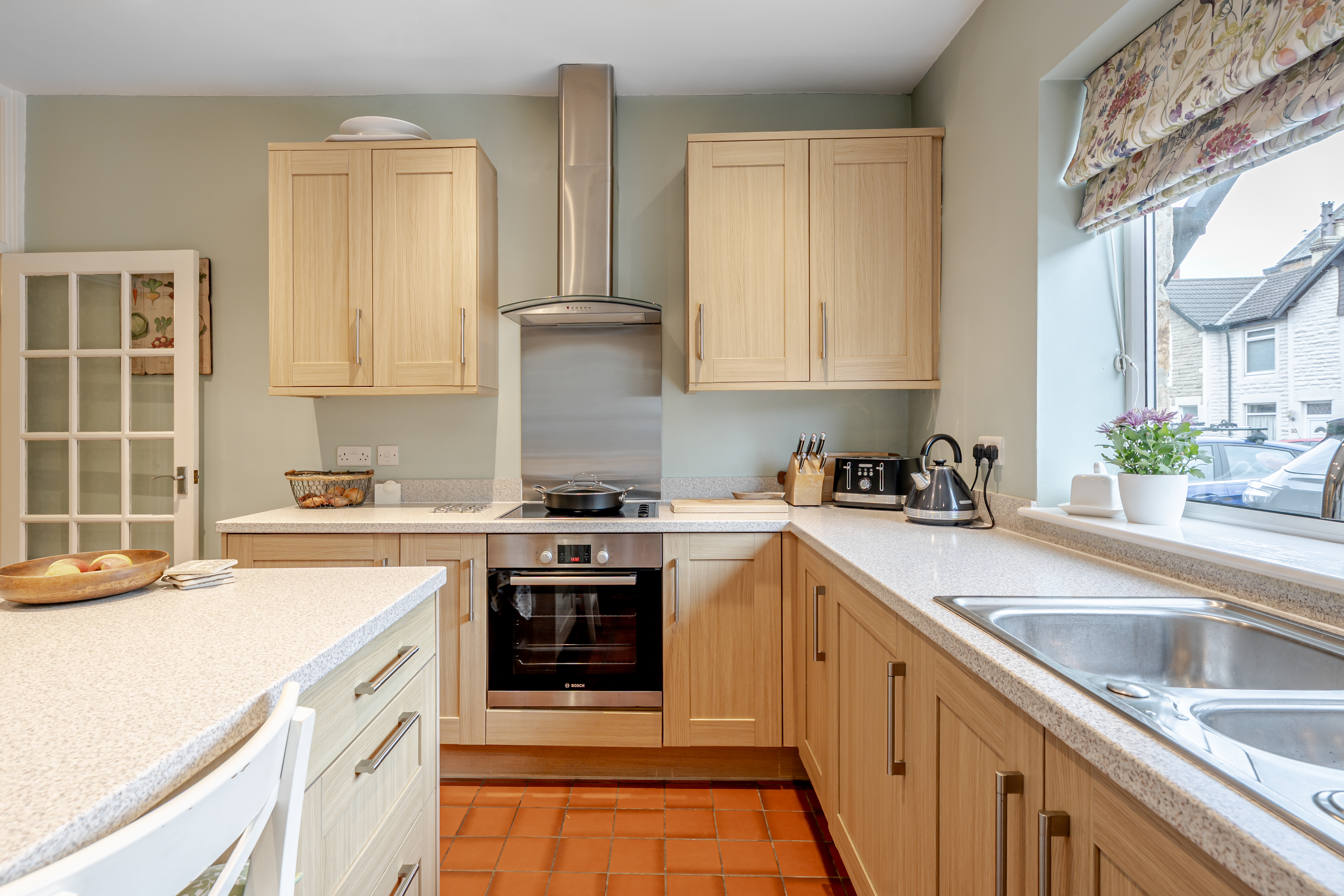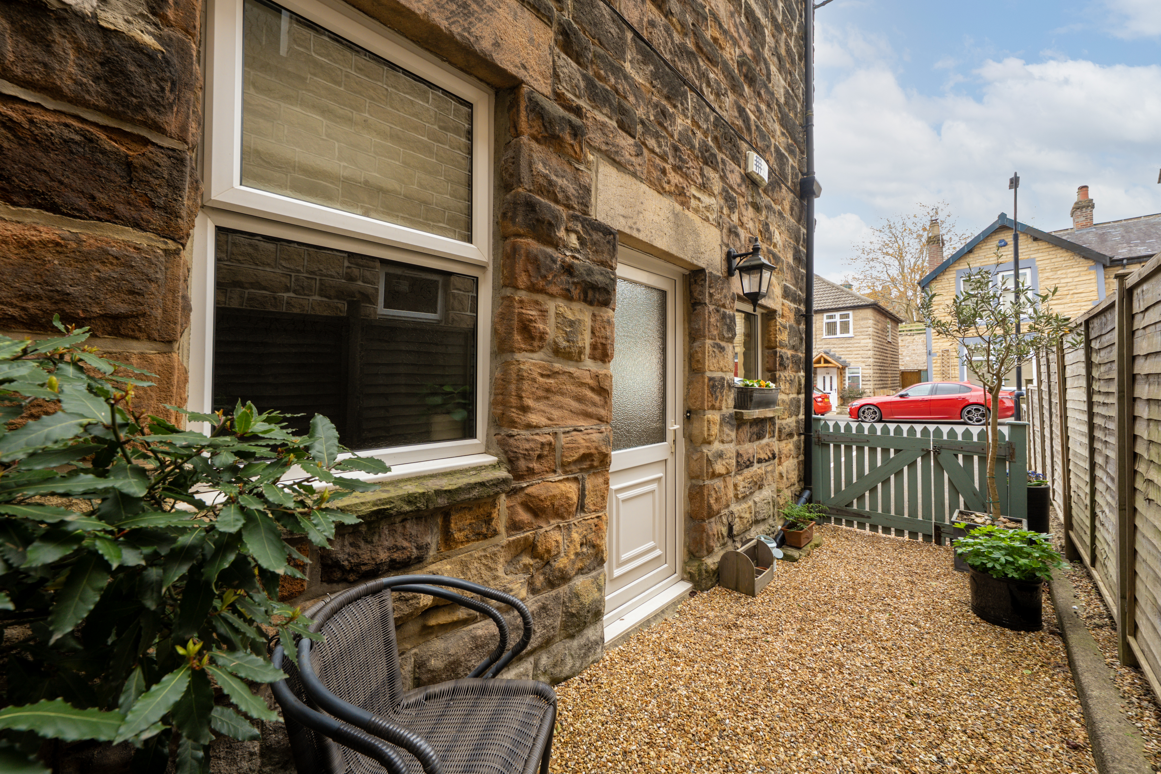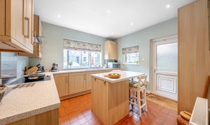 To the rear, the modern shaker-style kitchen is beautifully appointed with a central island breakfast bar and direct access to a private gravelled outdoor area — ideal for morning coffee or evening relaxation.