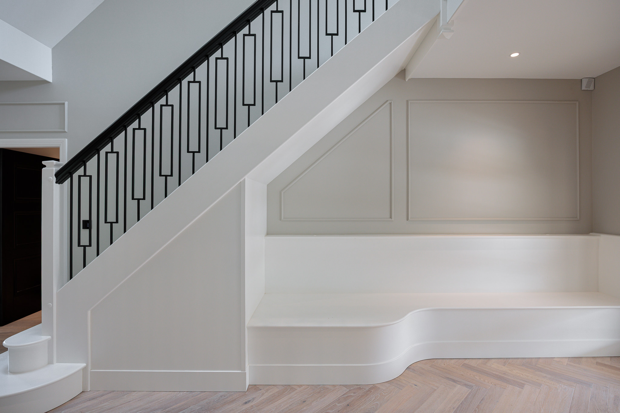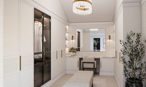 Enter through a grand galleried hallway, leading to a spacious ground floor that includes a vast kitchen/living/dining area at the rear with sliding doors opening to a generous terrace. The kitchen, pantry, utility, and laundry spaces are custom-designed by Sheerin Bespoke, fitted with premium Miele appliances. The ground floor also offers a playroom/media room, formal living room, study, utility room, and a W.C.