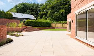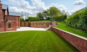 Outside, the property includes a large private driveway accessed through secure electric gates, complemented by a detached double garage with an upper room accessible via an external staircase and equipped with electric car charging points. The beautifully landscaped grounds feature a substantial stone or porcelain patio extending from the kitchen/living/dining area, a tiered garden with a brick-built feature staircase leading to a dining/seating area defined by a striking retaining wall, ambient lighting, a well-maintained lawn wrapping around the property, and stone pathways linking the garden’s sides.