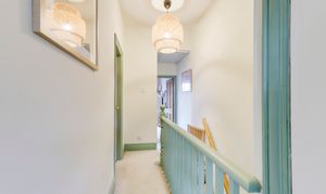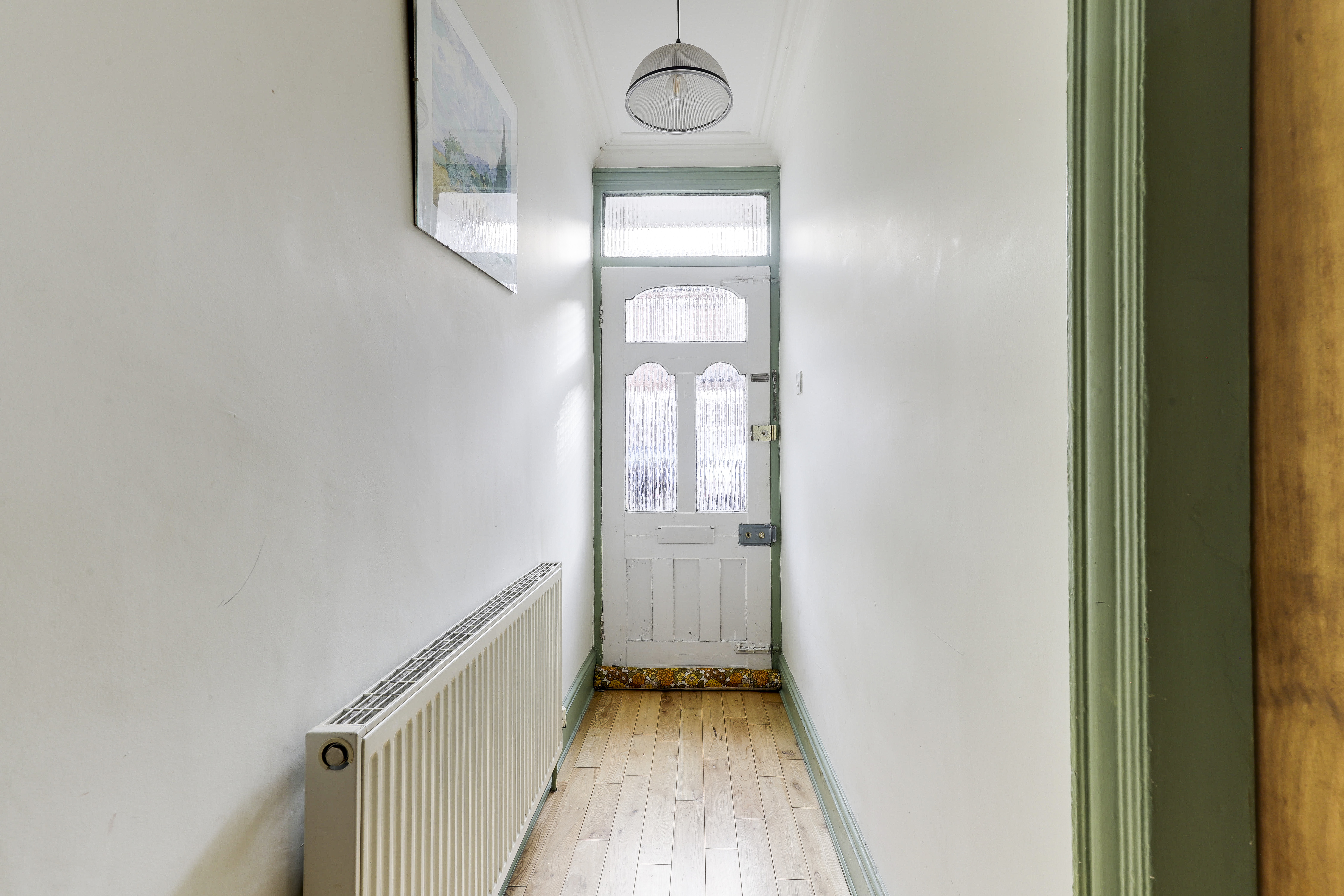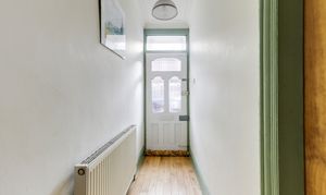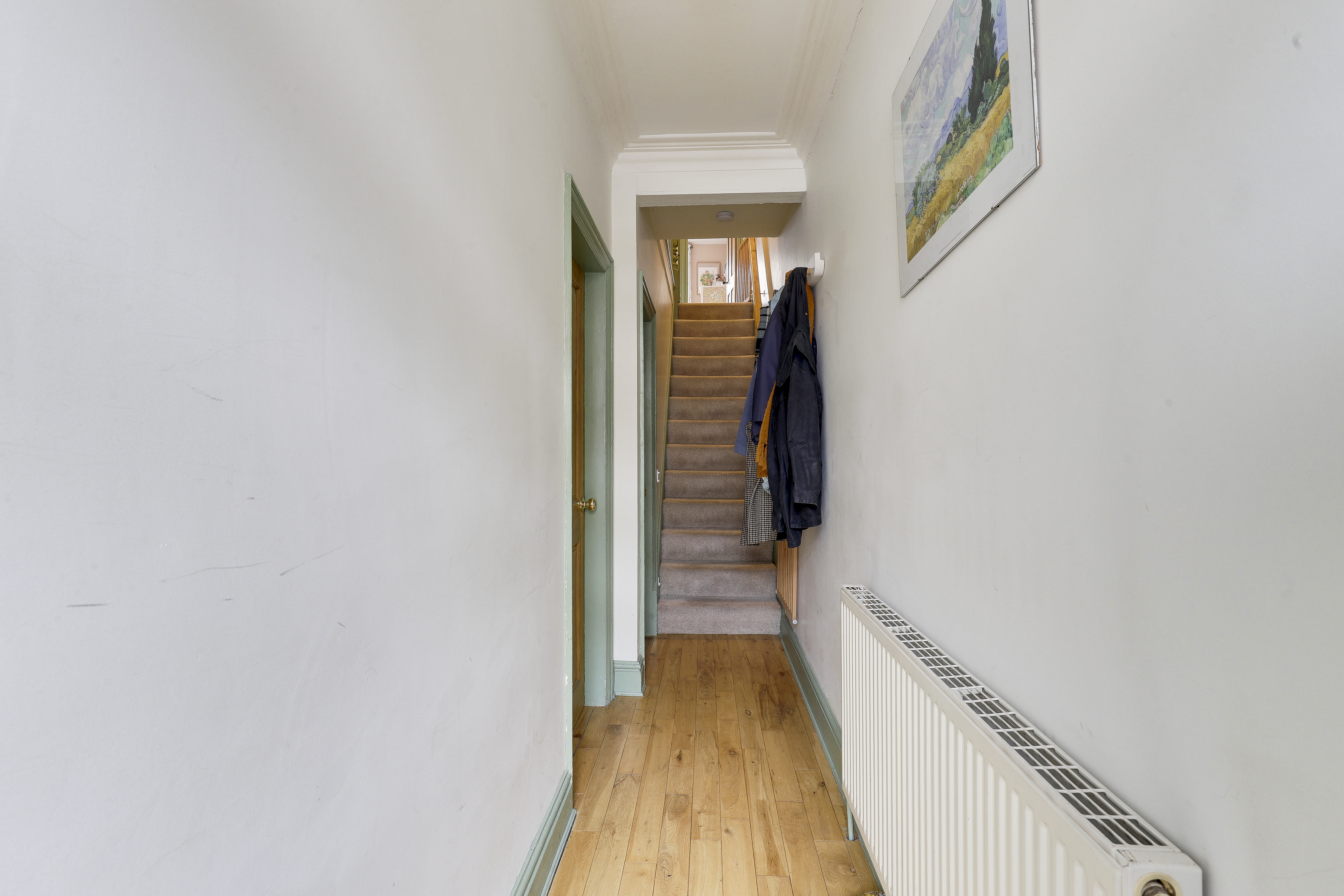 The hallway has oak wooden flooring, a radiator, carpeted stairs, coving and a single door providing access into the accommodation.
