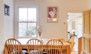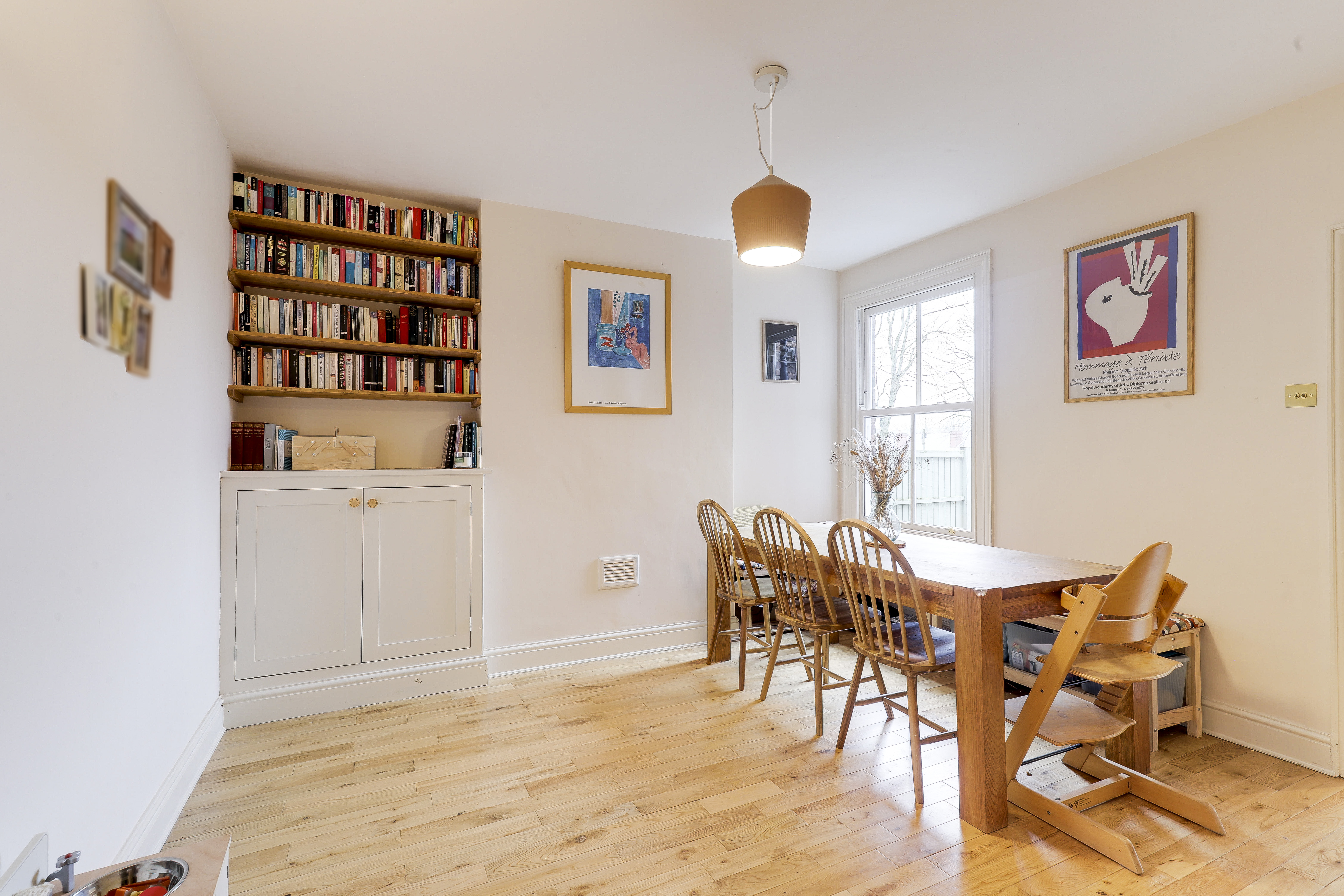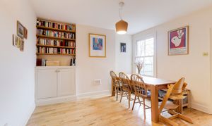 The dining room has a timber frame double-glazed sliding sash window to the rear elevation, oak wooden flooring, a radiator and a built-in cupboard.