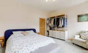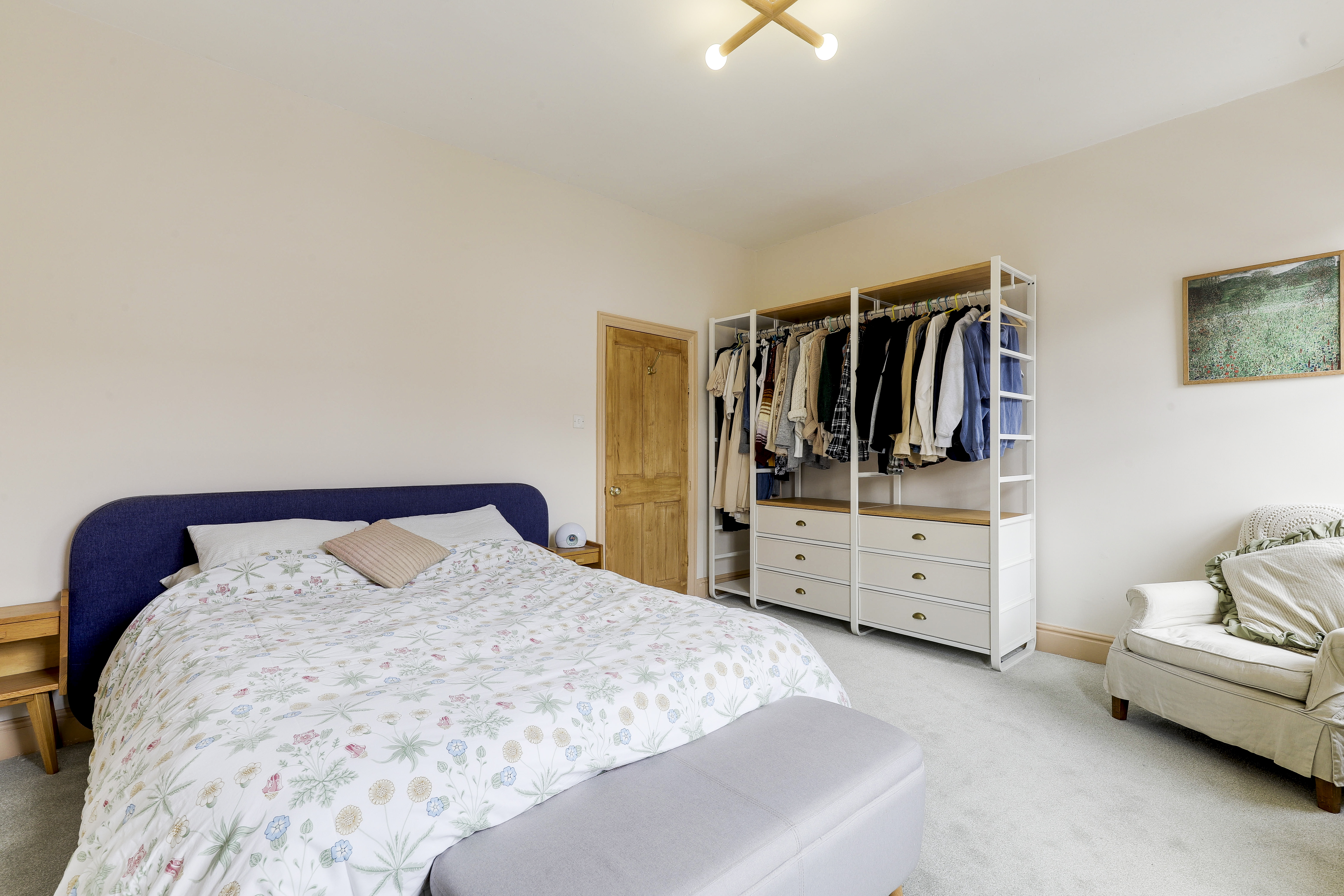 The main bedroom has timber frame double-glazed sliding sash windows to the front elevation, carpeted flooring and a column radiator.