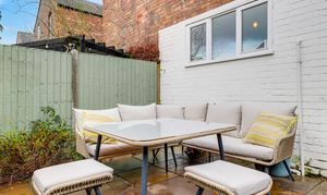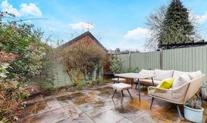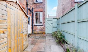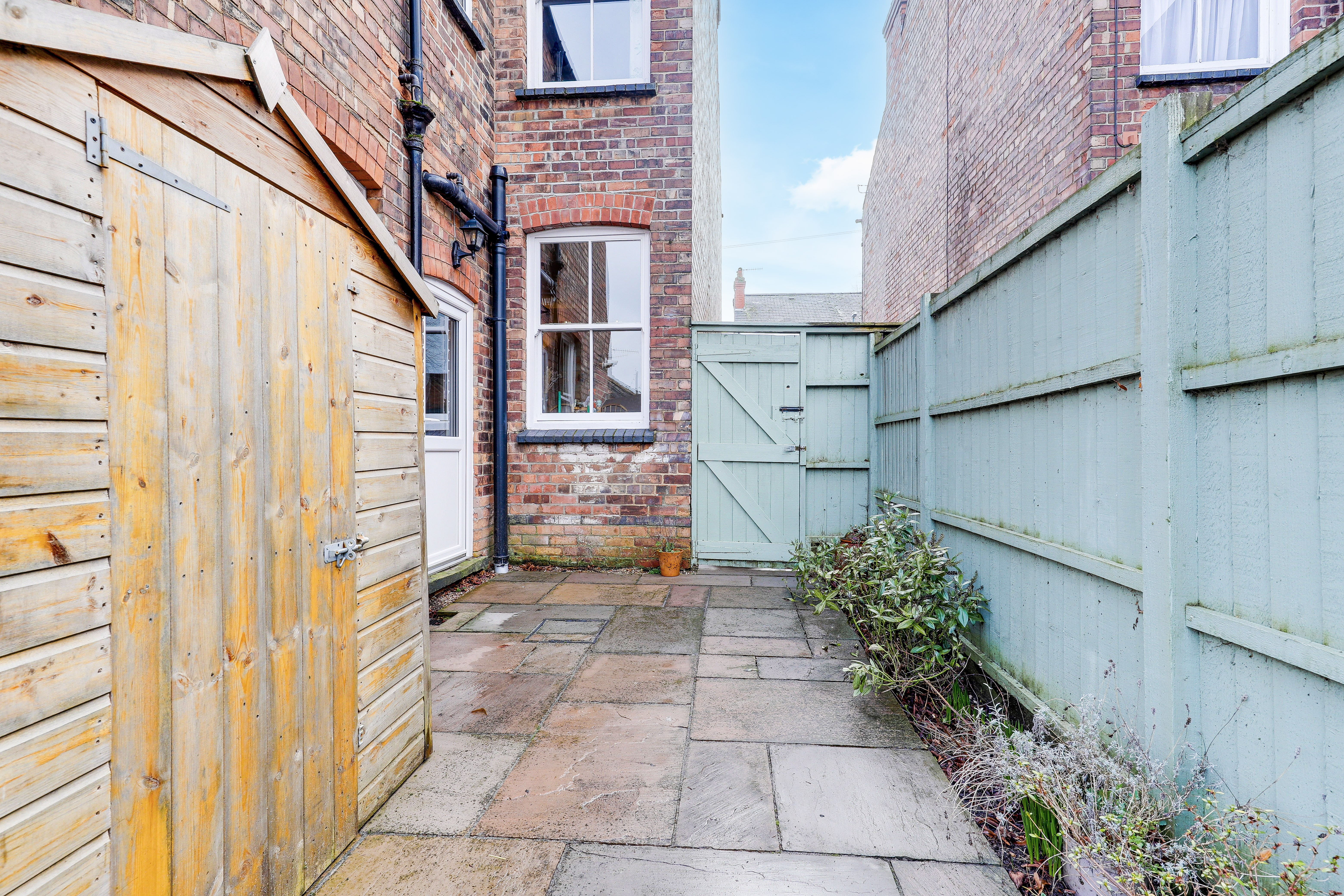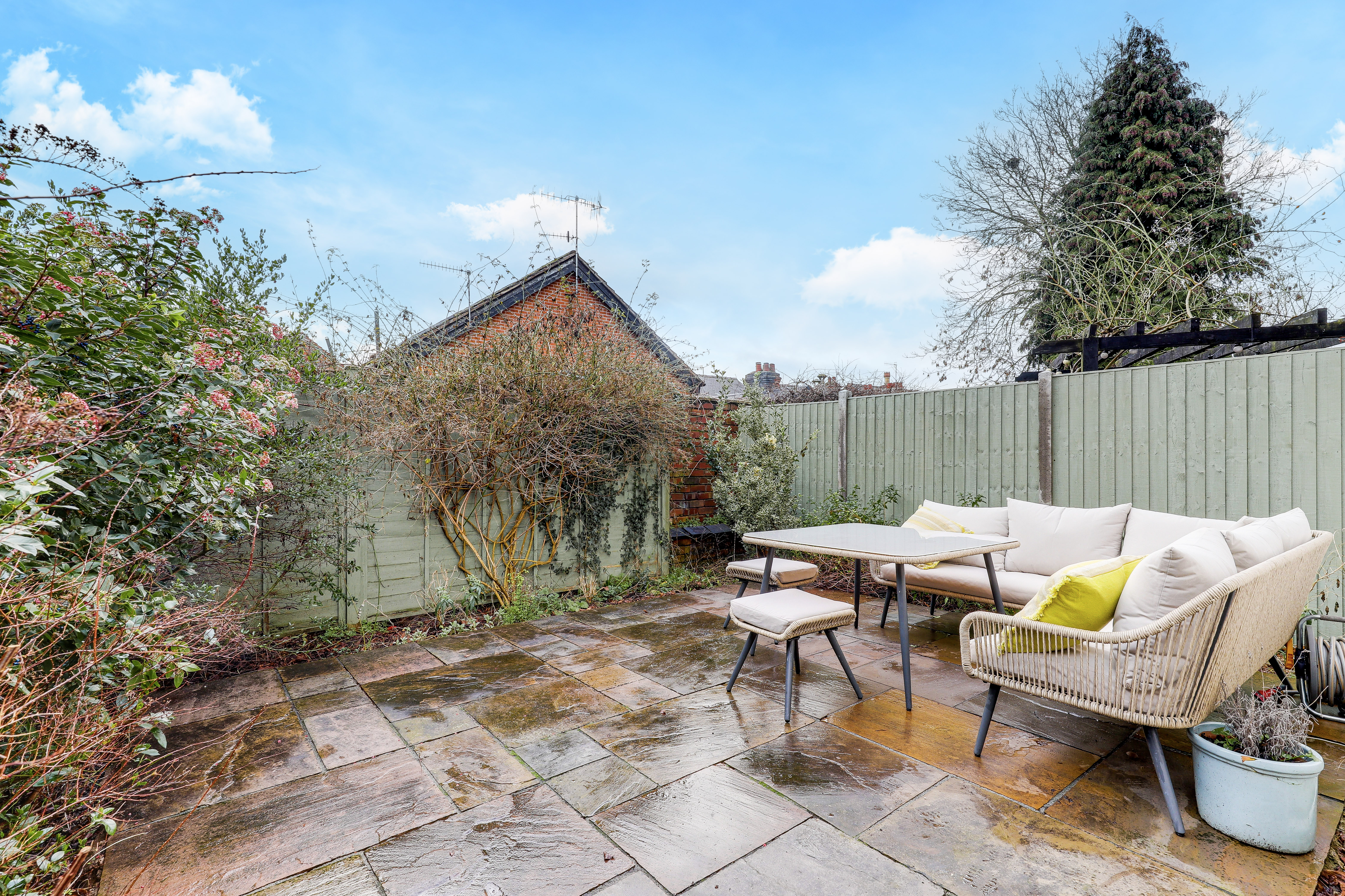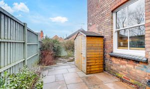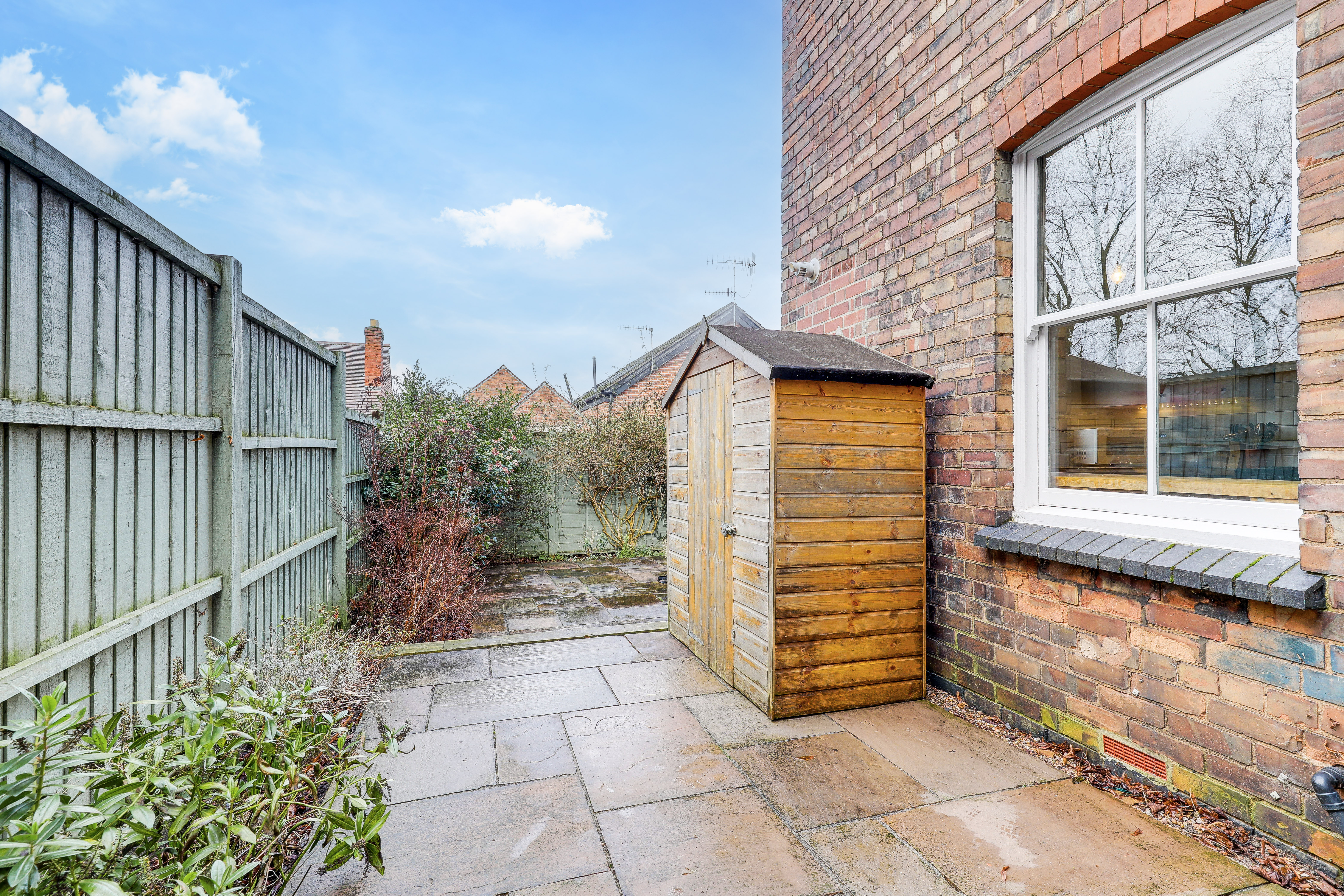 To the rear is a private paved garden with mature shrubs, a shed and fence-panelled boundaries.
