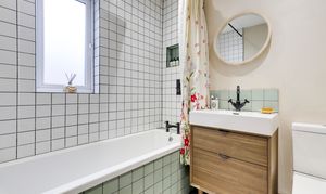 The bathroom has a low level flush W/C, a wall-mounted vanity style wash basin with a tiled splashback, a fitted bath with a mains-fed over the head rainfall shower and a tiled splashback, tiled flooring with underfloor heating, a heated towel rail, an extractor fan, recessed spotlights and a UPVC double-glazed obscure window to the side elevation.