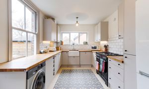 The kitchen has a range of fitted base and wall units with oak worktops and a tiled splashback, space for a Range cooker, an integrated dishwasher, a Belfast sink with a swan neck mixer tap, space and plumbing for a washing machine, space for a fridge-freezer, tiled flooring, a vertical column radiator, access down to the cellar, a timber frame double-glazed sliding sash window to the side elevation, a timber frame double-glazed window to the rear elevation and a single UPVC door providing access out to the garden.