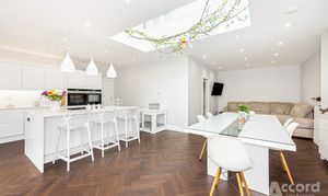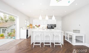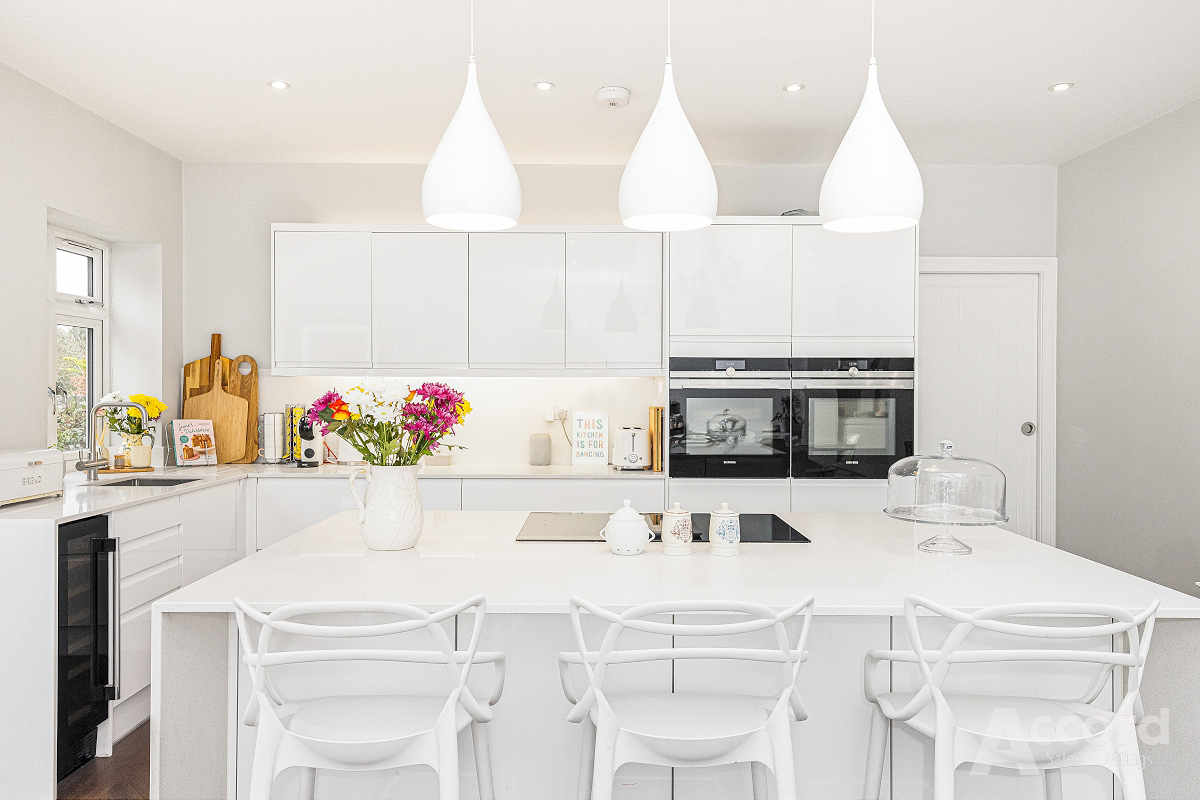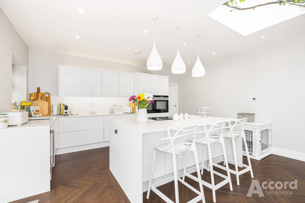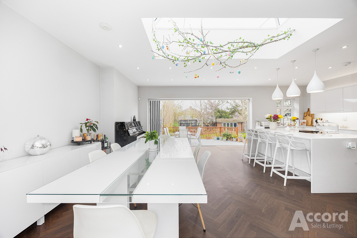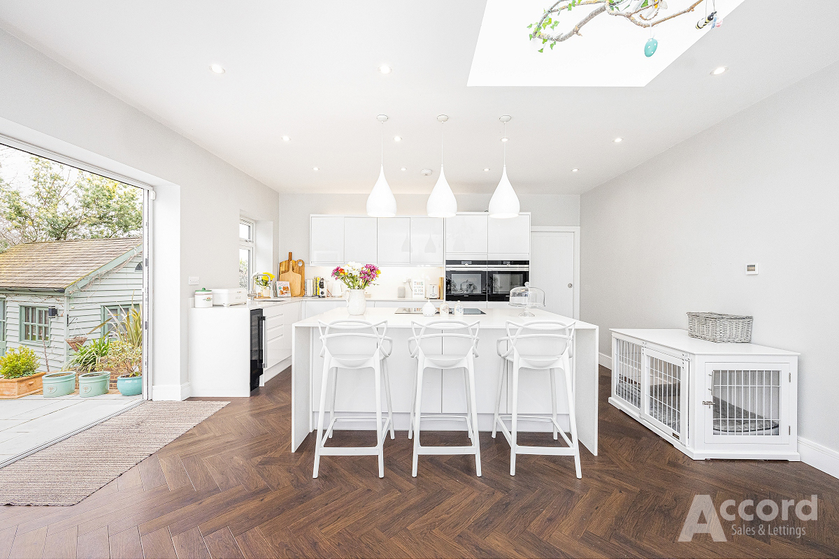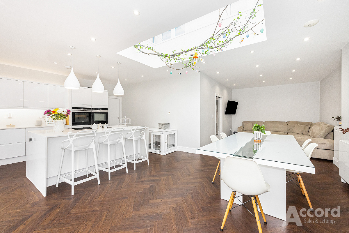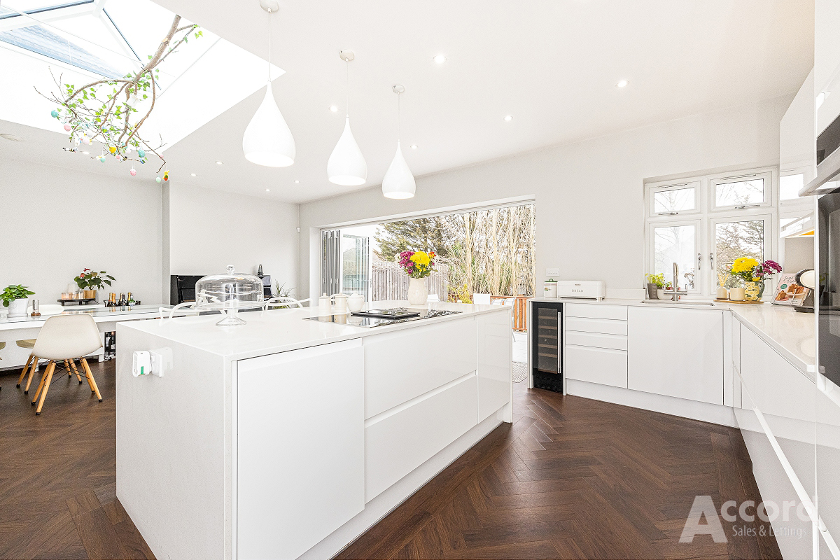 The ground floor opens with a welcoming entrance hall, a separate front reception room with bay window and feature fireplace, and a shower room that works particularly well for multi-generational living, especially alongside the option of a ground floor bedroom. To the rear, the property opens into an impressive kitchen, dining and living area that has clearly been designed for modern family life and entertaining. The kitchen has a contemporary finish with a large island and plenty of workspace, while skylights and bifold doors bring in lots of natural light and create a strong connection to the garden. There is also a useful utility area and pantry, adding to the practicality of the layout.