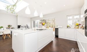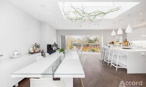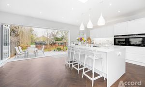 A substantial six bedroom semi-detached family home in a quiet Rise Park cul-de-sac, offering generous and adaptable accommodation, a striking open plan kitchen, dining and living space with a contemporary kitchen and island, a beautiful unoverlooked south facing rear garden, and two quality outbuildings suitable for a range of uses. This is a home that works especially well for larger families and multi-generational living, with plenty of flexibility in how the space is used.
