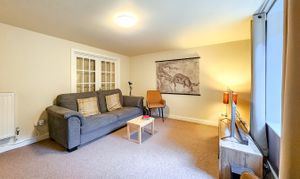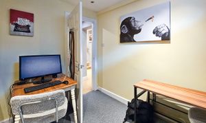 The accommodation is completed by a single bedroom, currently used as a home office, and a well-proportioned double bedroom featuring large built-in storage cupboards.