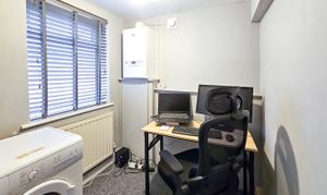 The property is entered at ground floor level, where a useful utility/office space is located. A staircase leads down to the main living accommodation.