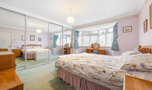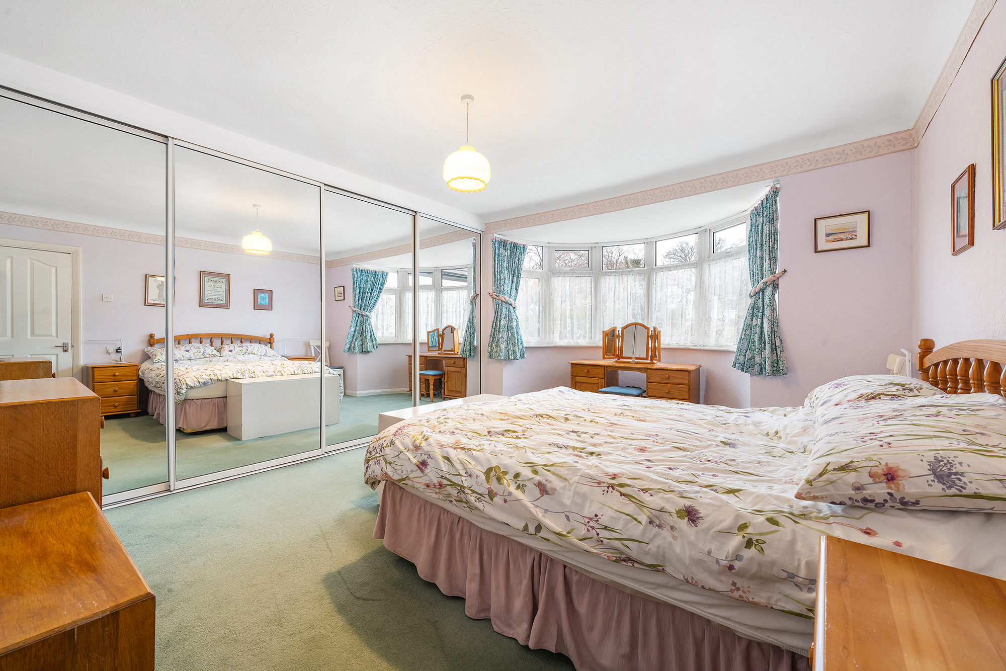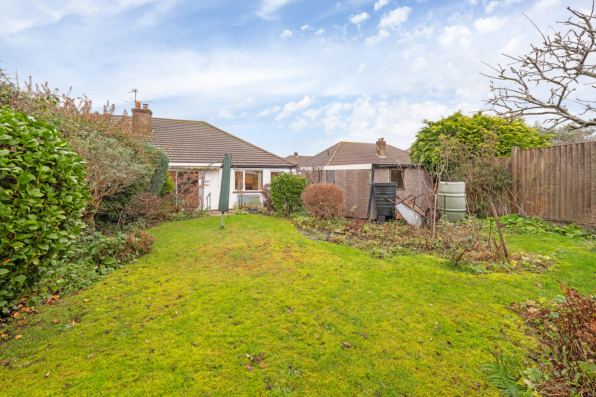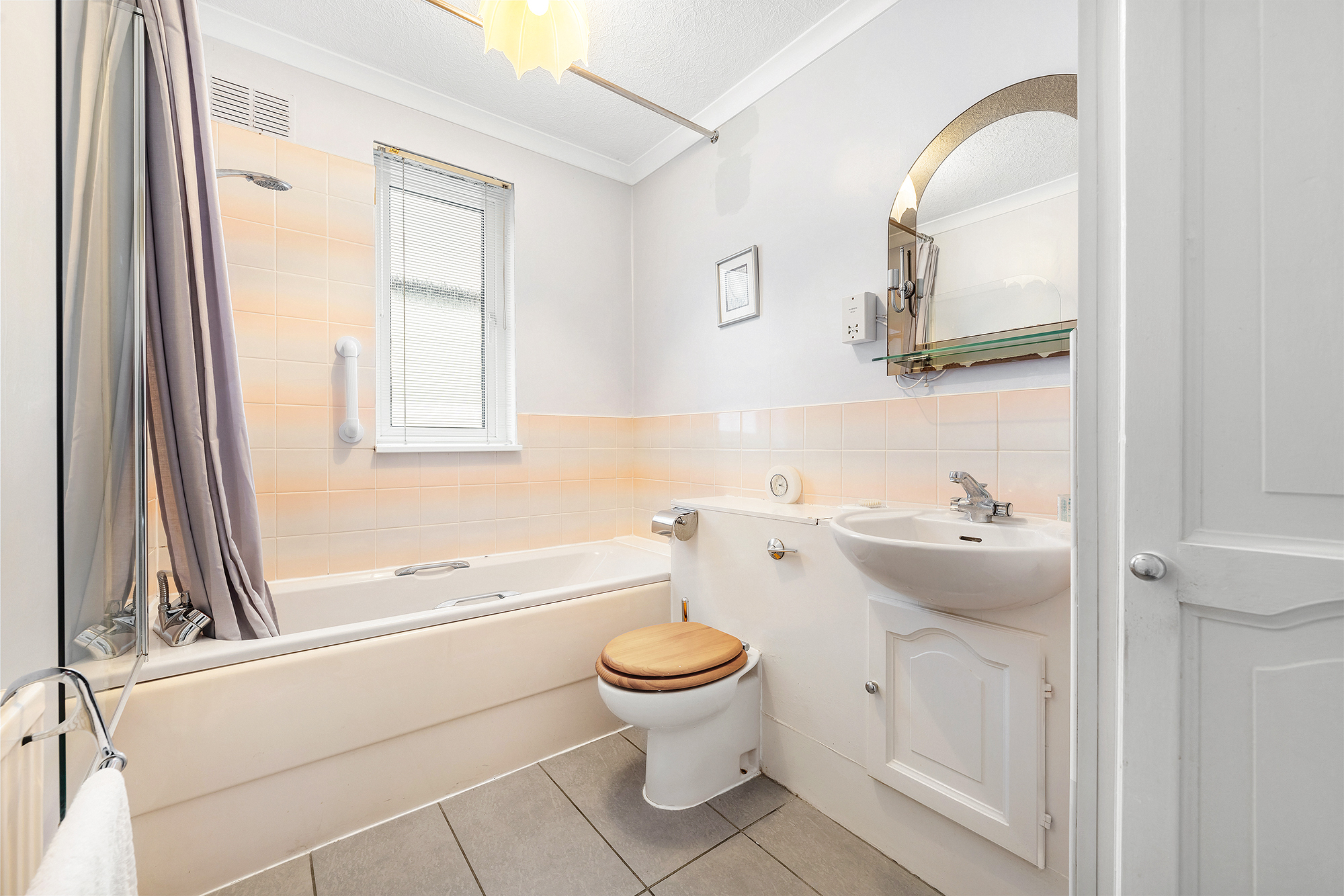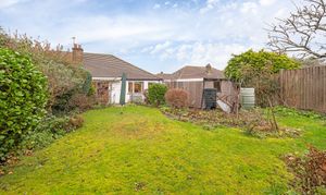 The bungalow features three well proportioned bedrooms, with the principal bedroom benefiting from generous built-in wardrobes, and the second double bedroom with ensuite shower room, while the third bedroom provides excellent versatility for use as guest bedroom, a home office, or a hobby space. The family bathroom comprises a fitted white bathroom suite, featuring a shower over the bath and vanity storage unit ensuring comfort and convenience.