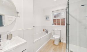 Ascending the stairs to the carpeted first floor landing, you will find loft access above and doors leading to three spacious bedrooms. The main bedroom enjoys a further bay window to the front and offers ample room for a large double bed, with alcoves on either side of the chimney breast perfect for freestanding wardrobes. The second bedroom enjoys a rear facing aspect with twin uPVC double glazed windows overlooking the garden, also providing plenty of space for a double bed and storage furniture. The final bedroom overlooks the rear and includes a useful integrated storage cupboard. Generously sized, it can comfortably be used as a double bedroom, a large study, or even a home studio. Completing the accommodation is the four piece family bathroom, featuring a bath with tiled surrounds, a separate glass enclosed walk in shower, vanity storage below the sink, and a wall-mounted heated towel rail.