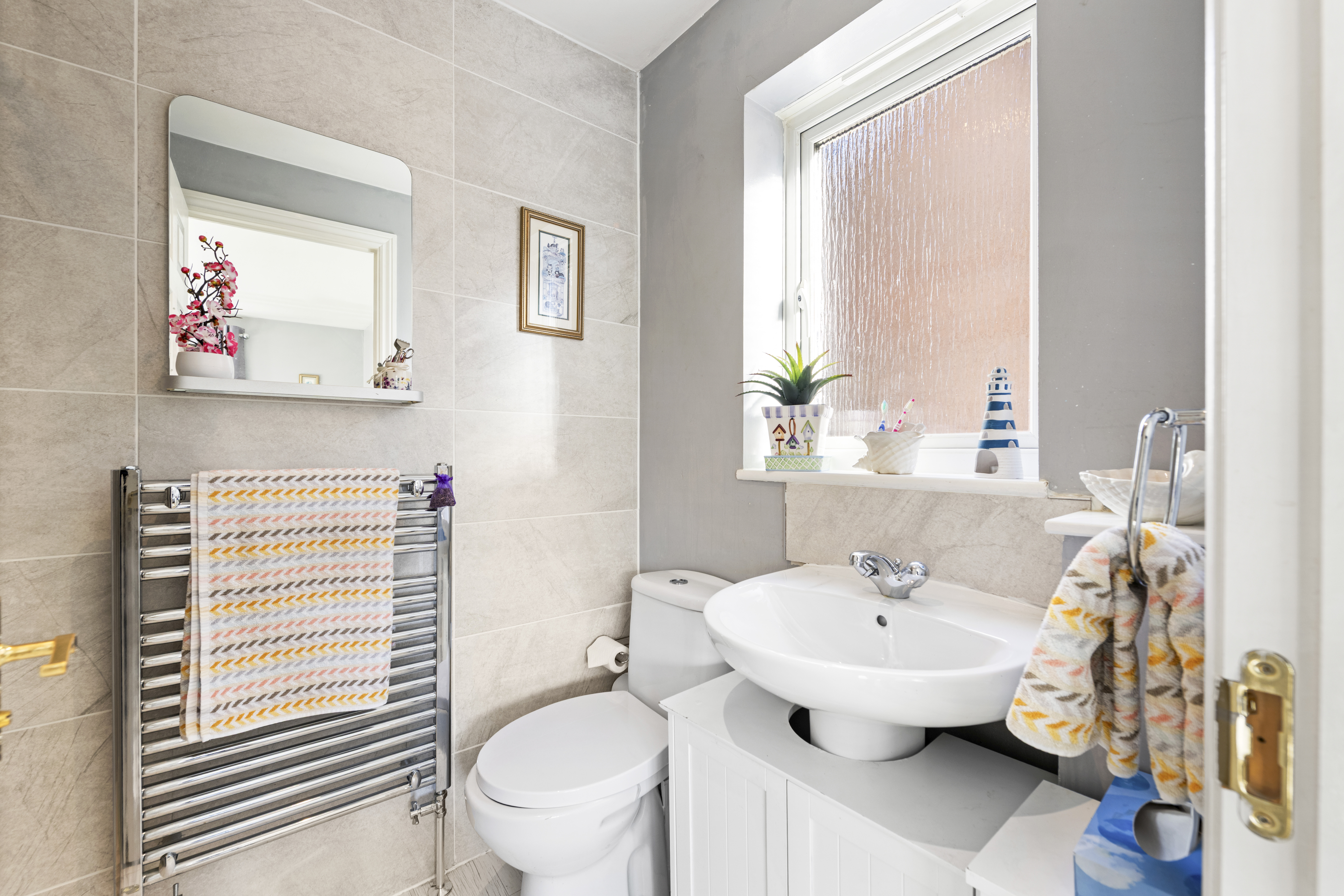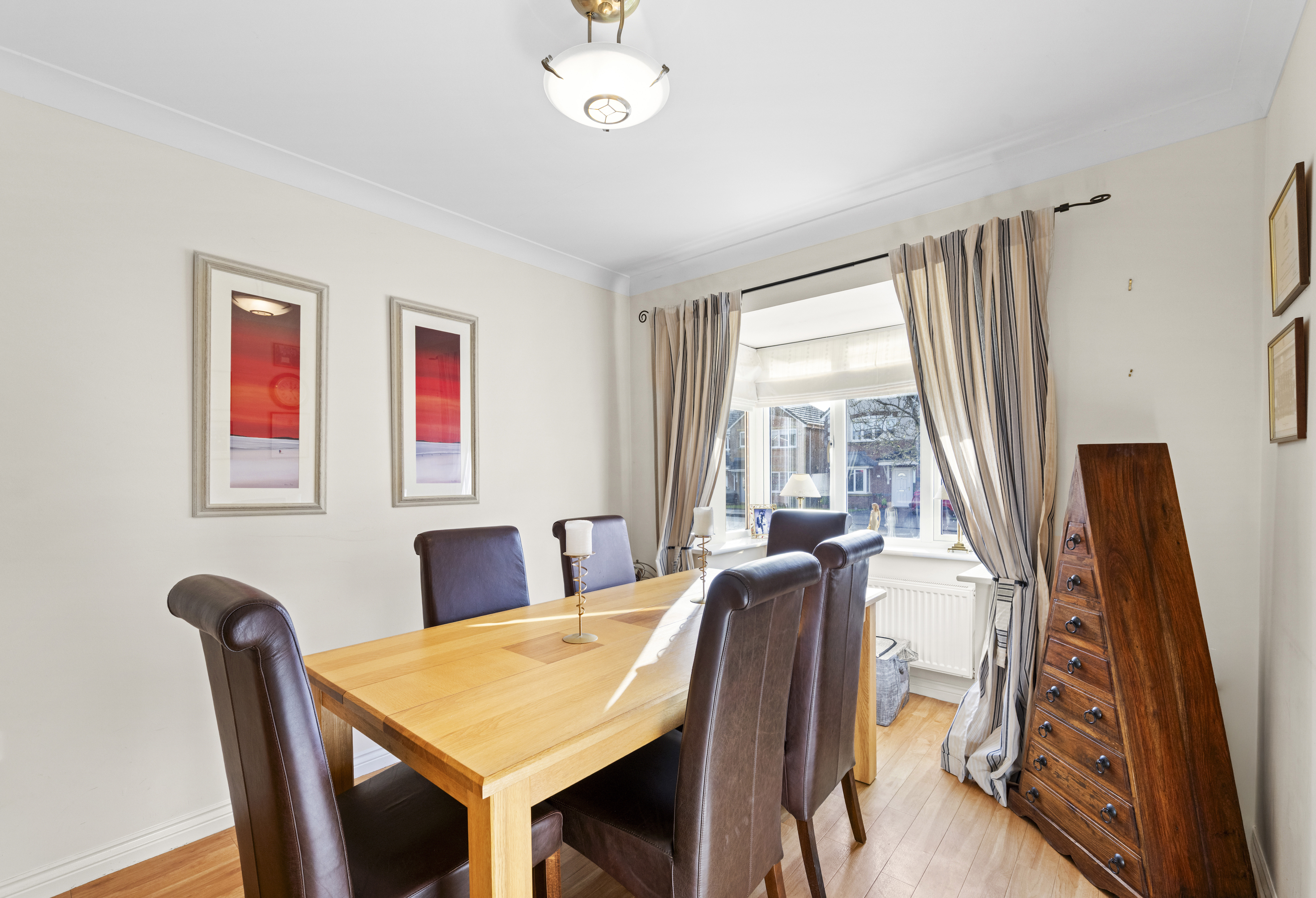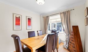 This well maintained property is designed to cater to the needs of modern family living, featuring a bright and spacious front facing lounge that invites natural light and provides an ideal setting for relaxation or entertaining guests. The well proportioned kitchen/diner is thoughtfully arranged to allow for both every-day meals and more formal occasions, complemented by ample cabinetry and workspace. The separate dining room, enhanced by a charming bay style window, creates a welcoming atmosphere for family gatherings or hosting friends.