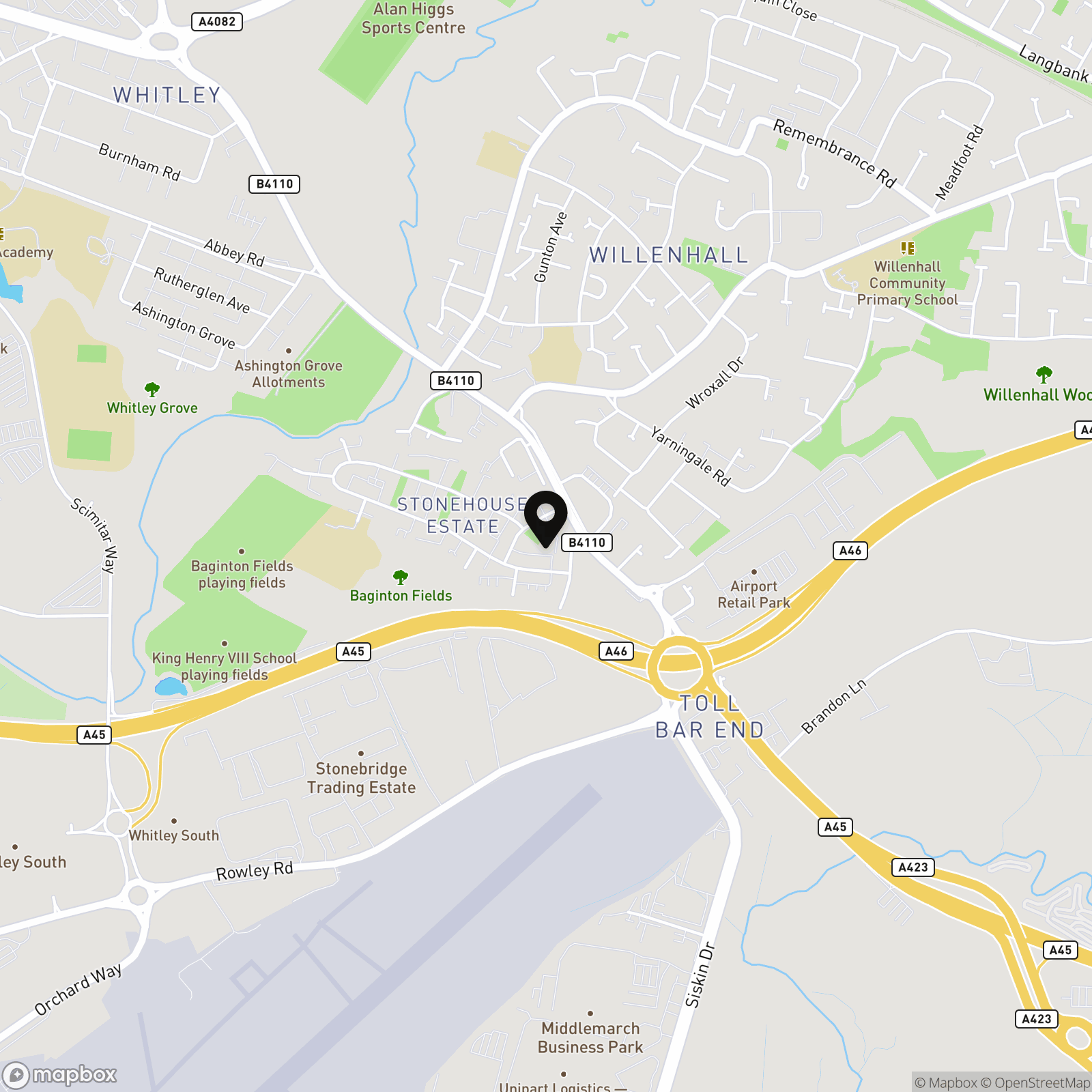 Local amenities and sites include the nearby retail park, Whitley Abbey school, and JLR.
