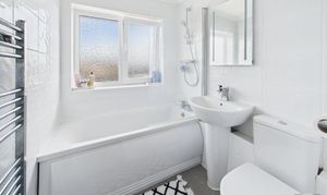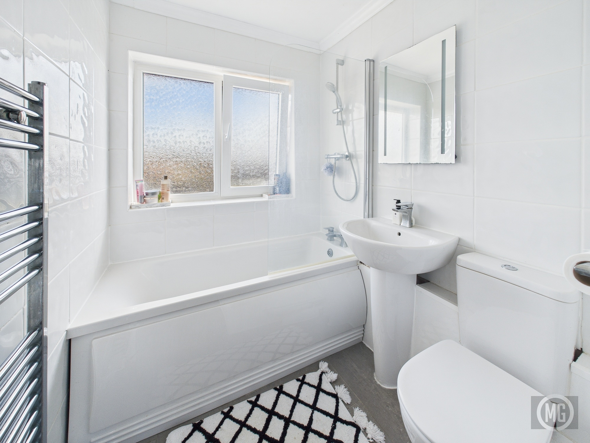 Tiled flooring, heated towel radiator window to rear aspect, mixer shower over bath, WC, hand basin