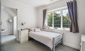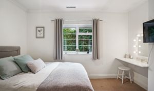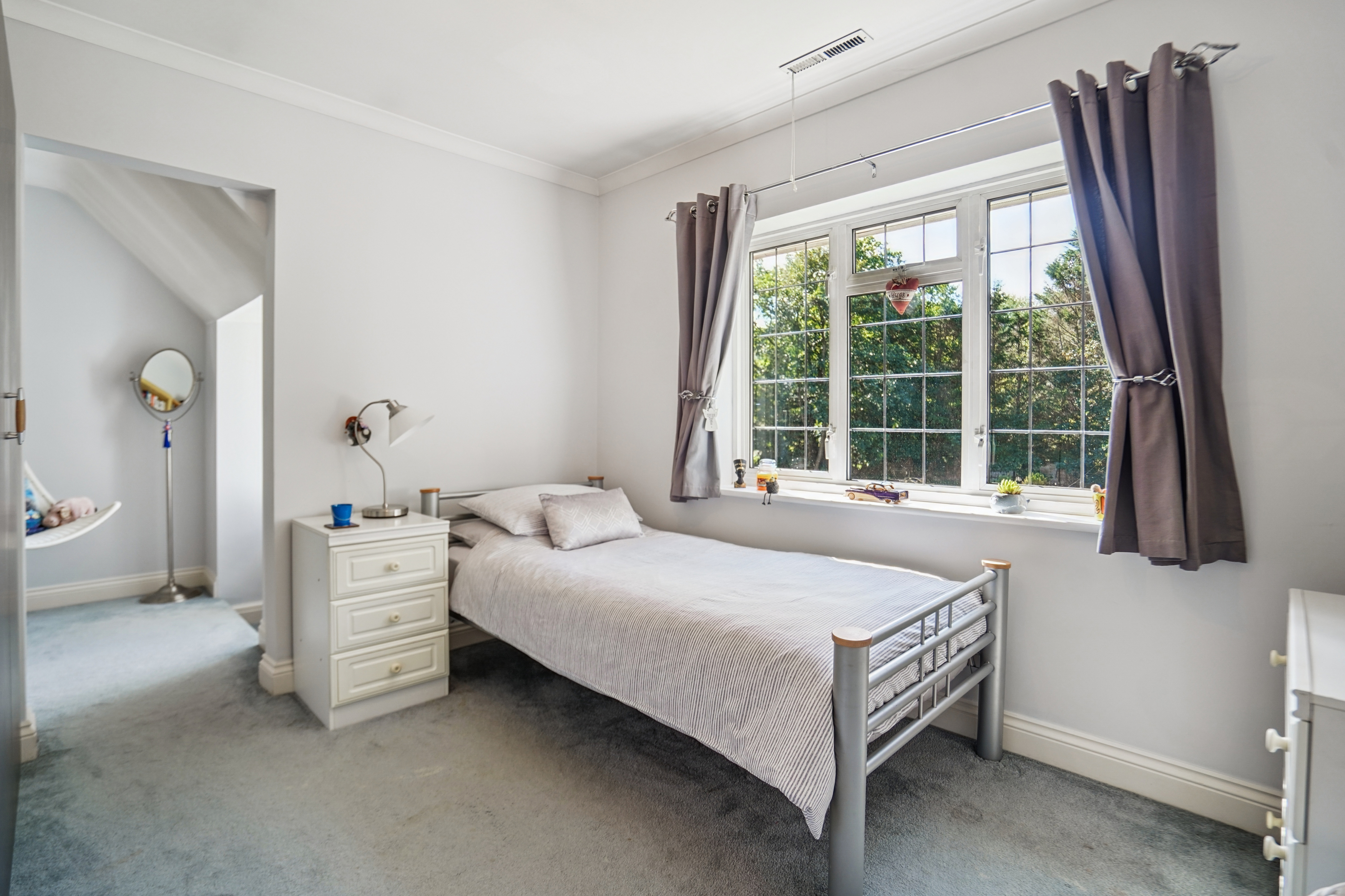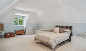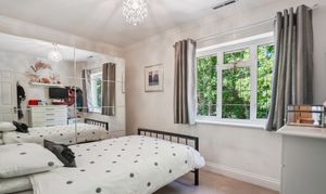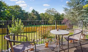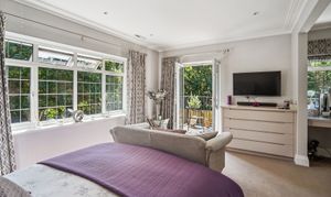 The principle suite is an elegant sanctuary, with bespoke built in wardrobes, a luxurious en suite shower room, and French doors opening to a private balcony – the perfect spot for morning coffee or evening drinks while enjoying views over the gardens.