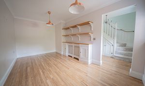 Upon entry, you are greeted by a welcoming hallway, thoughtfully designed with ample storage solutions and a convenient guest cloakroom. The property beckons you further into its embrace, revealing two expansive reception rooms. The first, a generously proportioned dual aspect living room, floods with natural light, creating an inviting ambience. Adjacent is a versatile dining room, offering the flexibility to be transformed into a playroom or snug to suit your lifestyle.