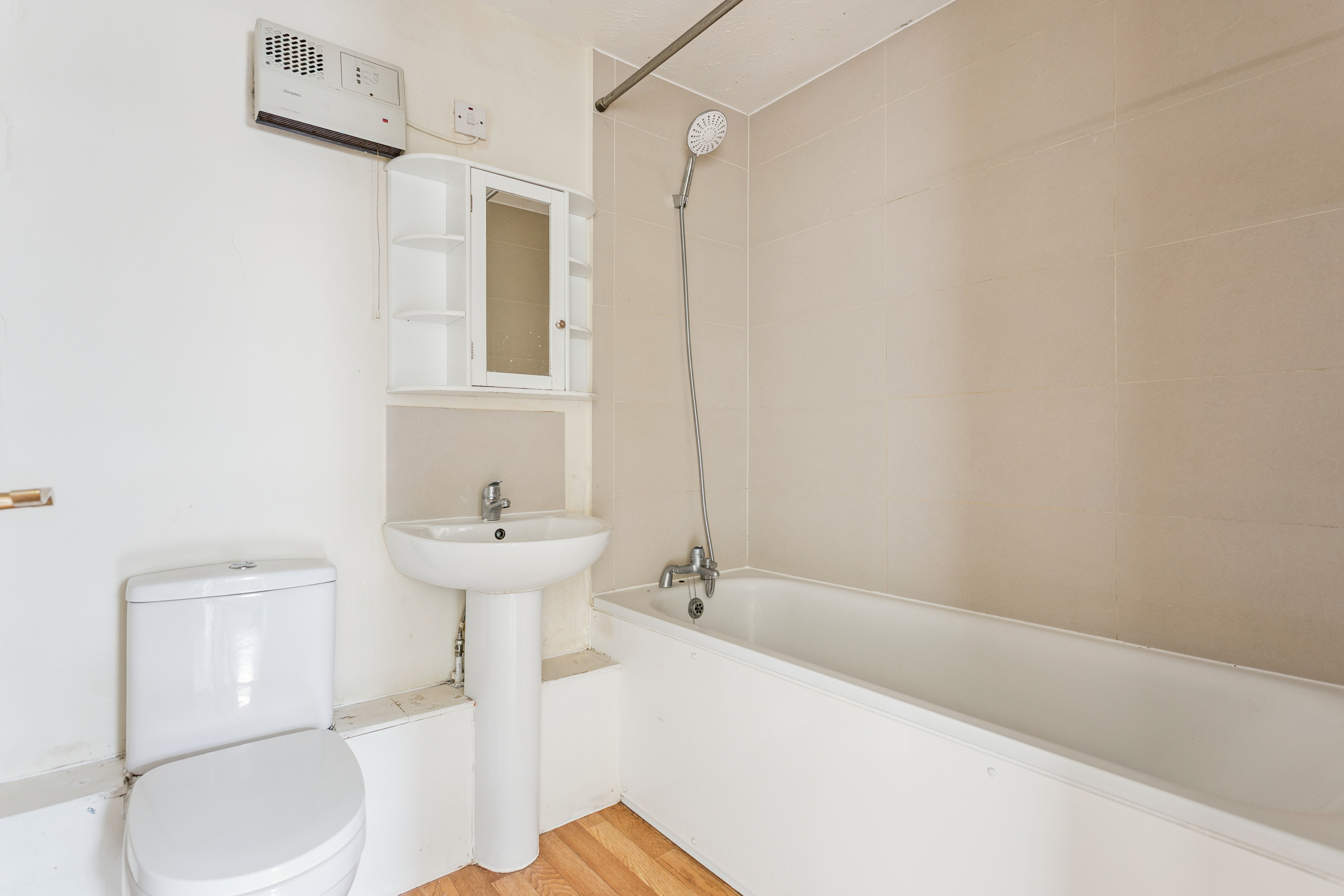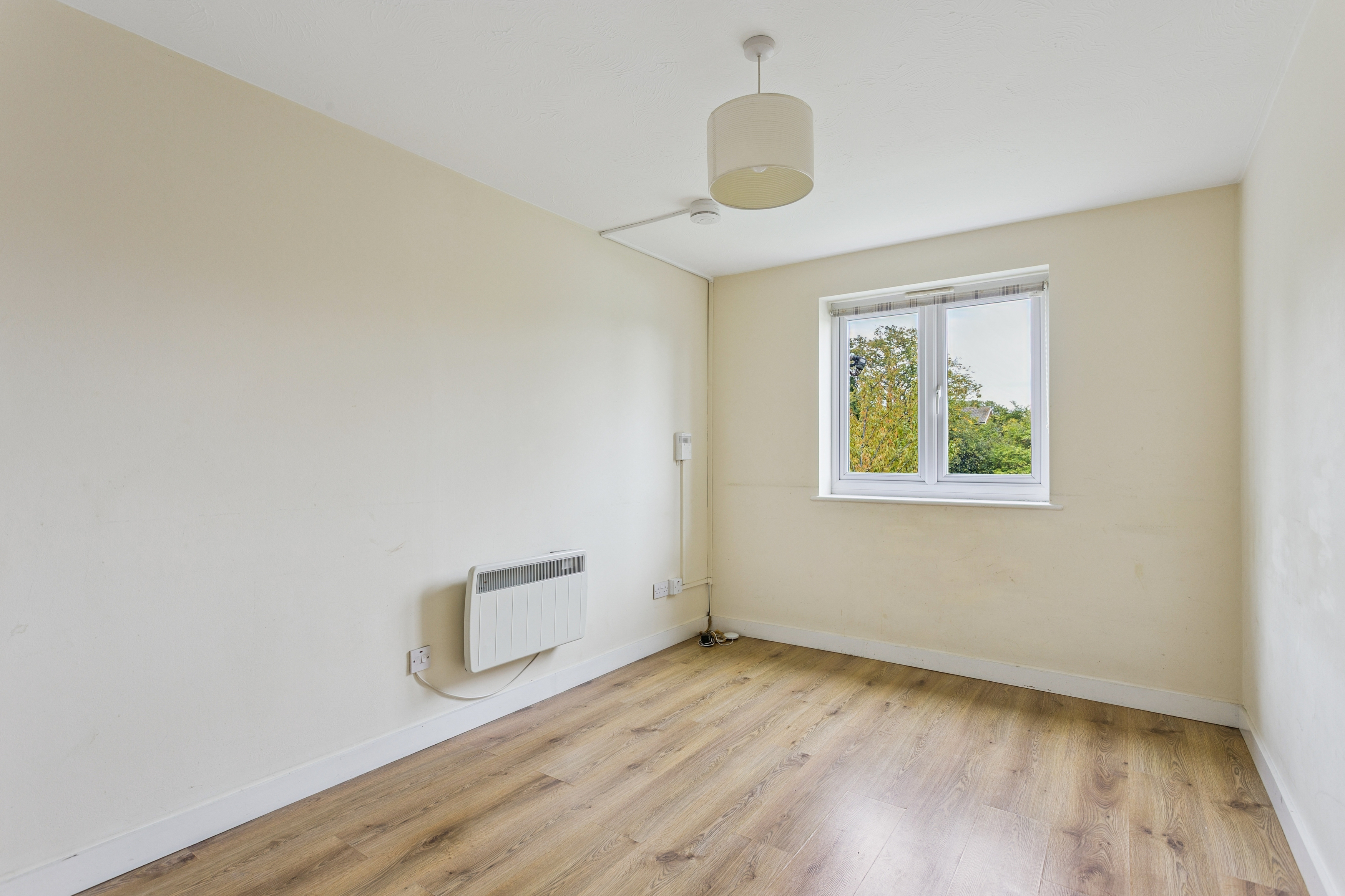 The double bedroom enjoys a peaceful rear aspect with pleasant green outlooks, while the bathroom is fitted with a white suite comprising a bath with overhead shower, basin, and WC.