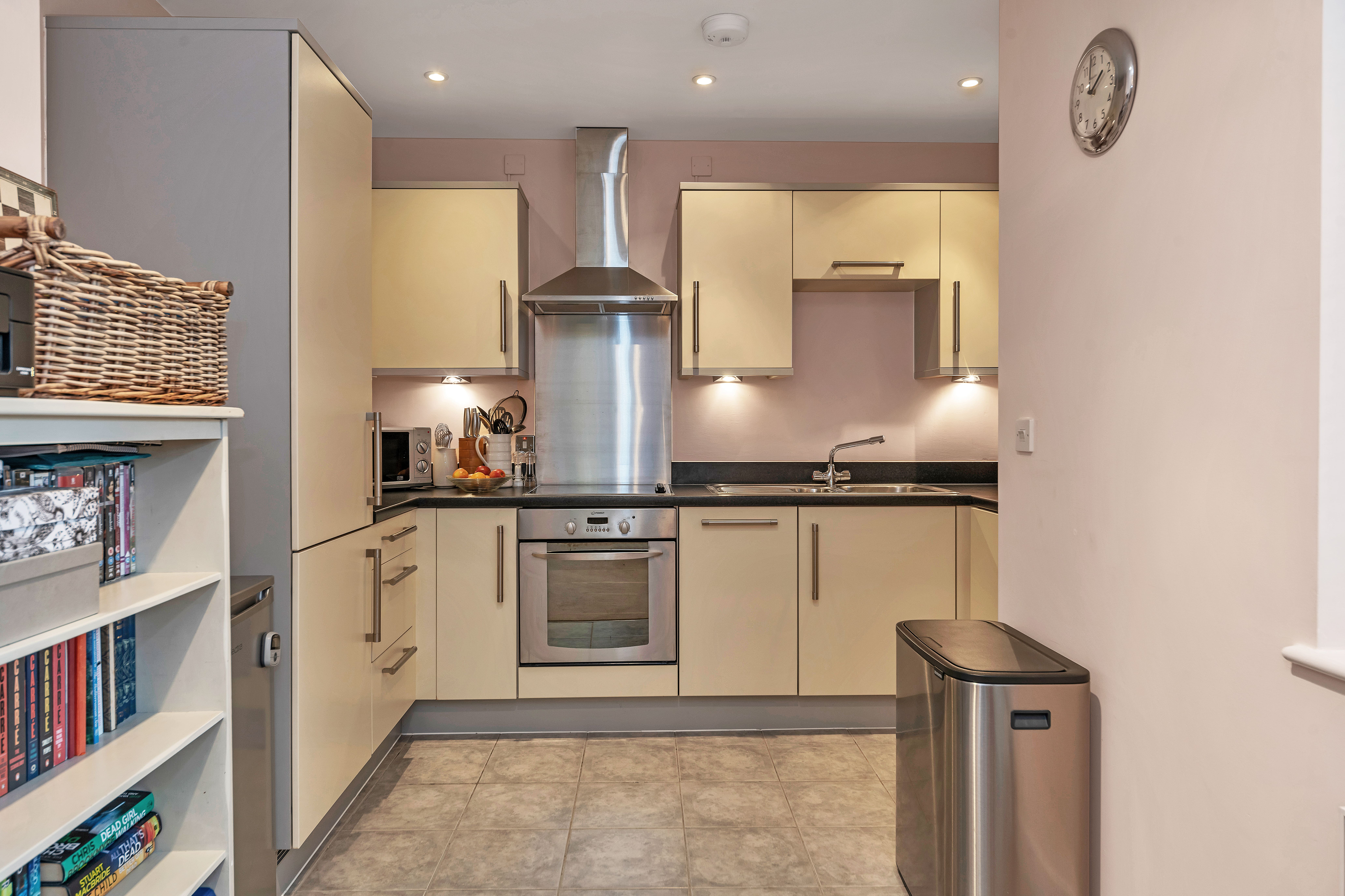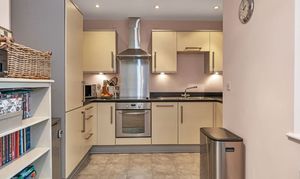 The kitchen/lounge/dining room is wonderfully open-plan and benefits from windows to a dual aspect, plush carpets, neutral decor, pendant and spot lighting, and ample room for lounge, dining and storage furniture. In the kitchen area, there is a range of base and wall units, laminate worktops, tiled flooring, inset and under-cabinet lighting, an integrated oven, dishwasher, fridge/freezer and extractor hood, and space for further small kitchen appliances.