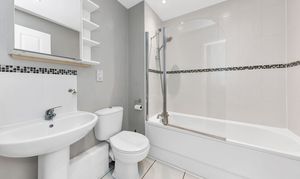 Through to the sleeping quarters, this spacious property offers a large double bedroom, integrated wardrobes, and a bathroom comprising a bath with an overhead shower, a WC, a hand wash basin and tiled flooring.