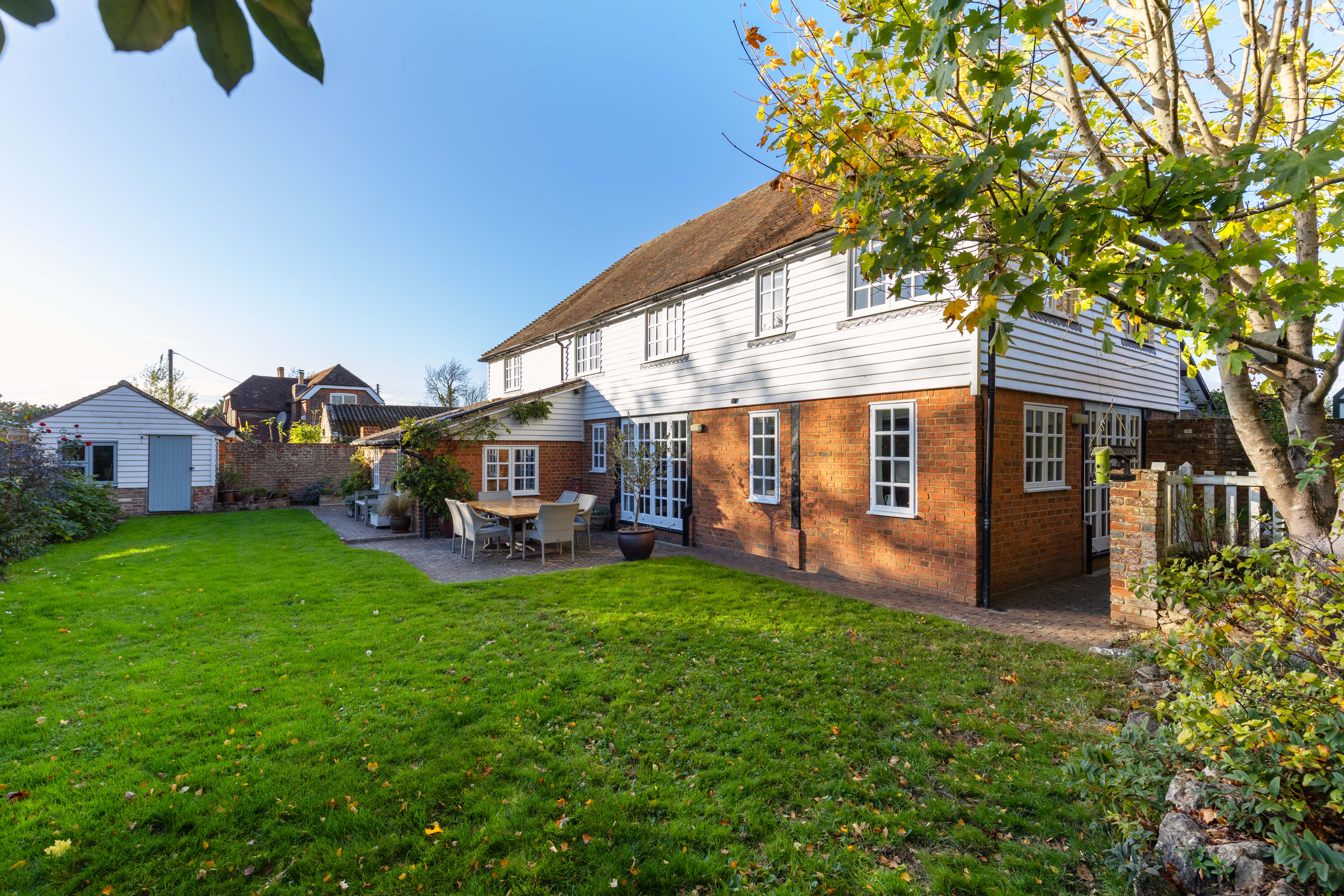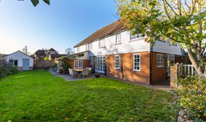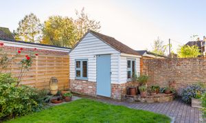 Outside, the property enjoys a thoughtful, well-tended garden, with the rear garden having a desirable southerly aspect, and laid mainly to lawn with an area of terrace, bordered by mature shrubs and flowers offering year-round colour. A unique walled courtyard garden set to the rear incorporates part of the original Oast roundel, creating an enchanting, secluded space ideal for alfresco dining. Additional features include a brick-built potting shed, log store, outdoor lighting, and side access.