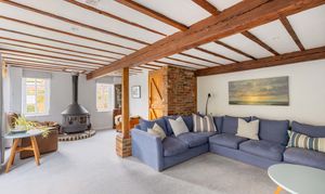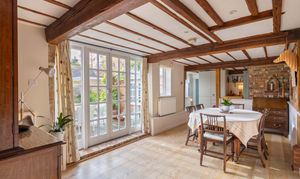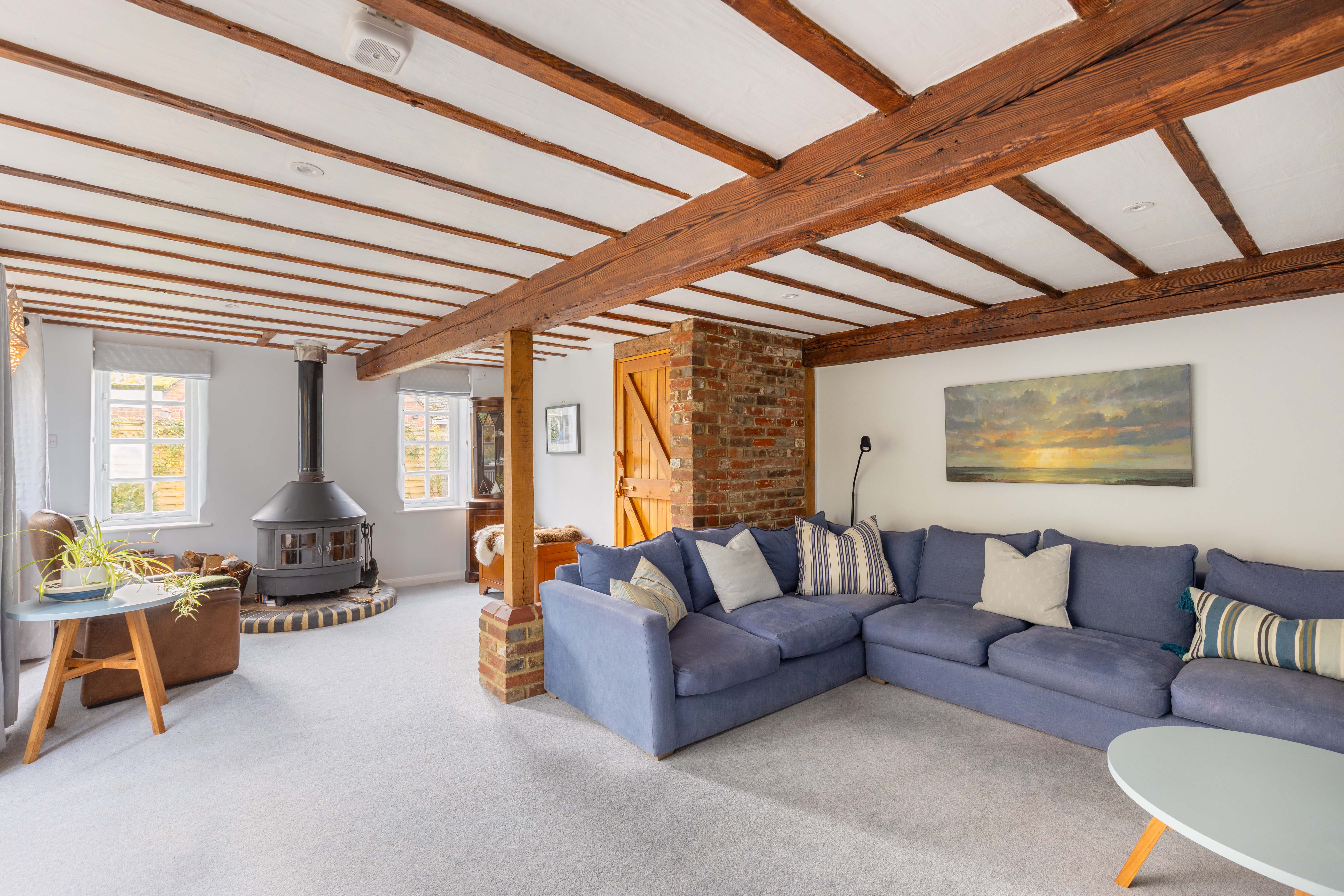 The ground floor is perfectly designed for both comfort and sociable living. The ‘L’-shaped sitting room sits to the end of the house, featuring exposed beams, a large wood-burning stove set on a brick hearth, and casement doors that open onto a delightful rear courtyard garden.