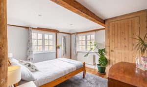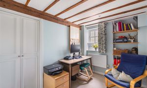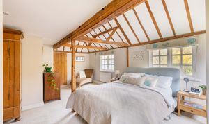 Upstairs, the impressive galleried landing - set beneath a vaulted ceiling with exposed beams - has been thoughtfully arranged as a library or study area. The spacious master bedroom enjoys double-aspect windows, a part-vaulted ceiling, fitted wardrobes, and a contemporary en-suite shower room. Three further well-proportioned bedrooms and a beautifully appointed family bathroom with a double-ended bath, separate shower, and underfloor heating complete the first floor.