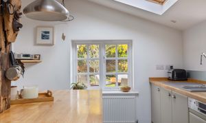 The beautifully fitted kitchen/breakfast room is the true heart of this home, seamlessly connecting to the dining room, which features tongue-and-groove panelling, fitted cupboards, and doors leading to the garden. The kitchen has a comprehensive range of modern units with complementary worktops, Neff double ovens including a combi microwave, induction hob, and an island with breakfast bar. Natural light floods the space through two large Velux skylights and garden-facing windows. An adjacent separate utility room provides further storage, a sink, and plumbing for appliances.