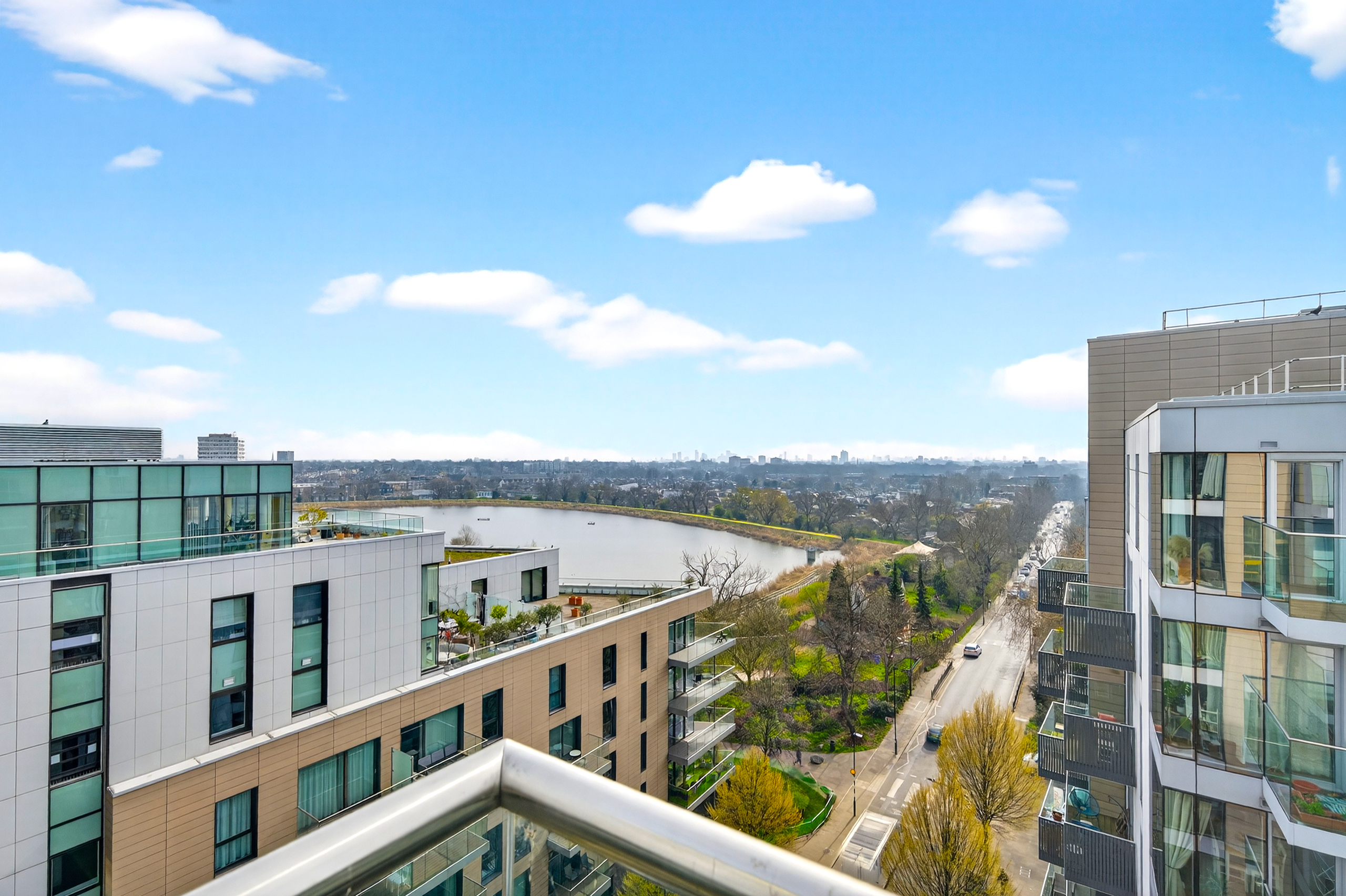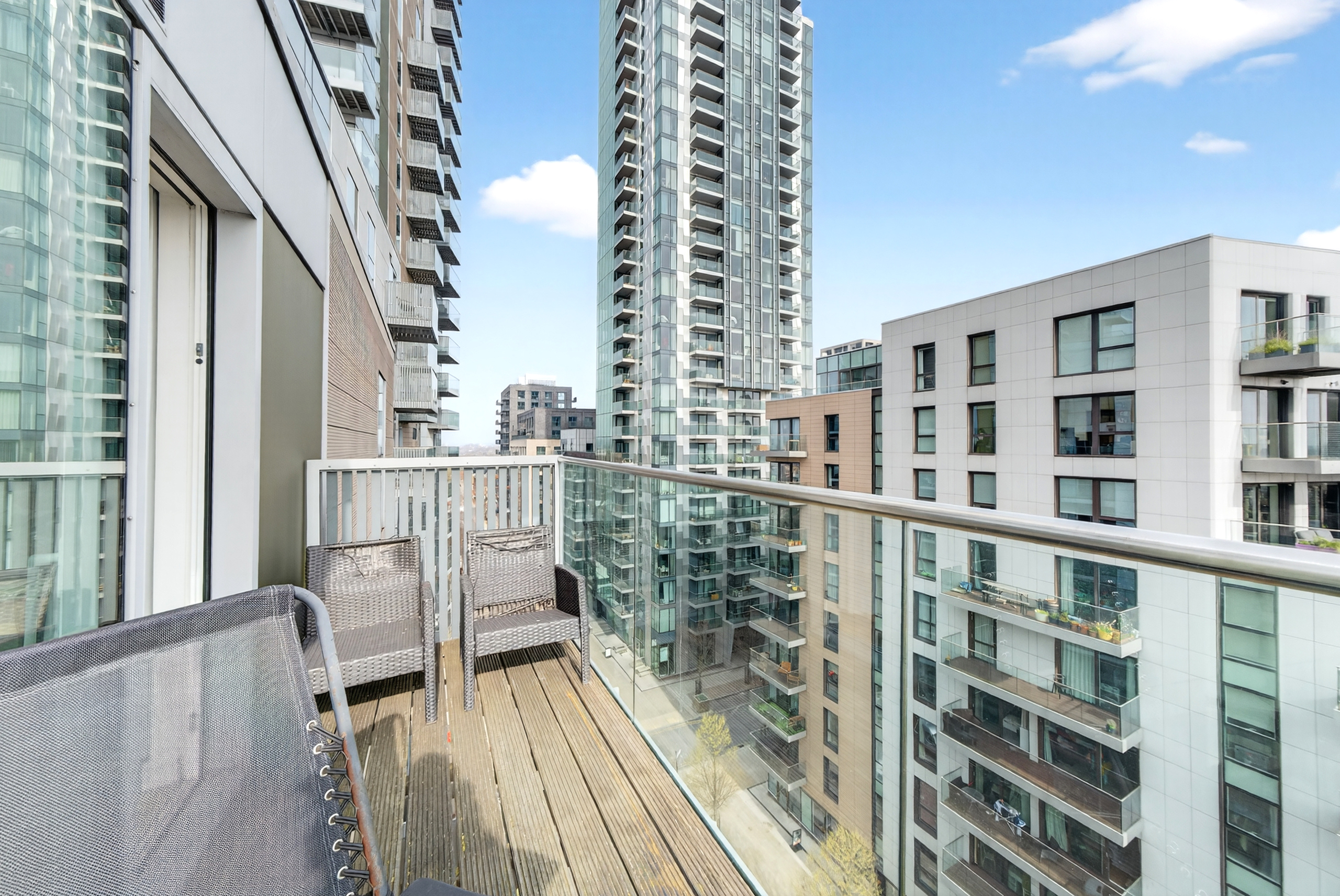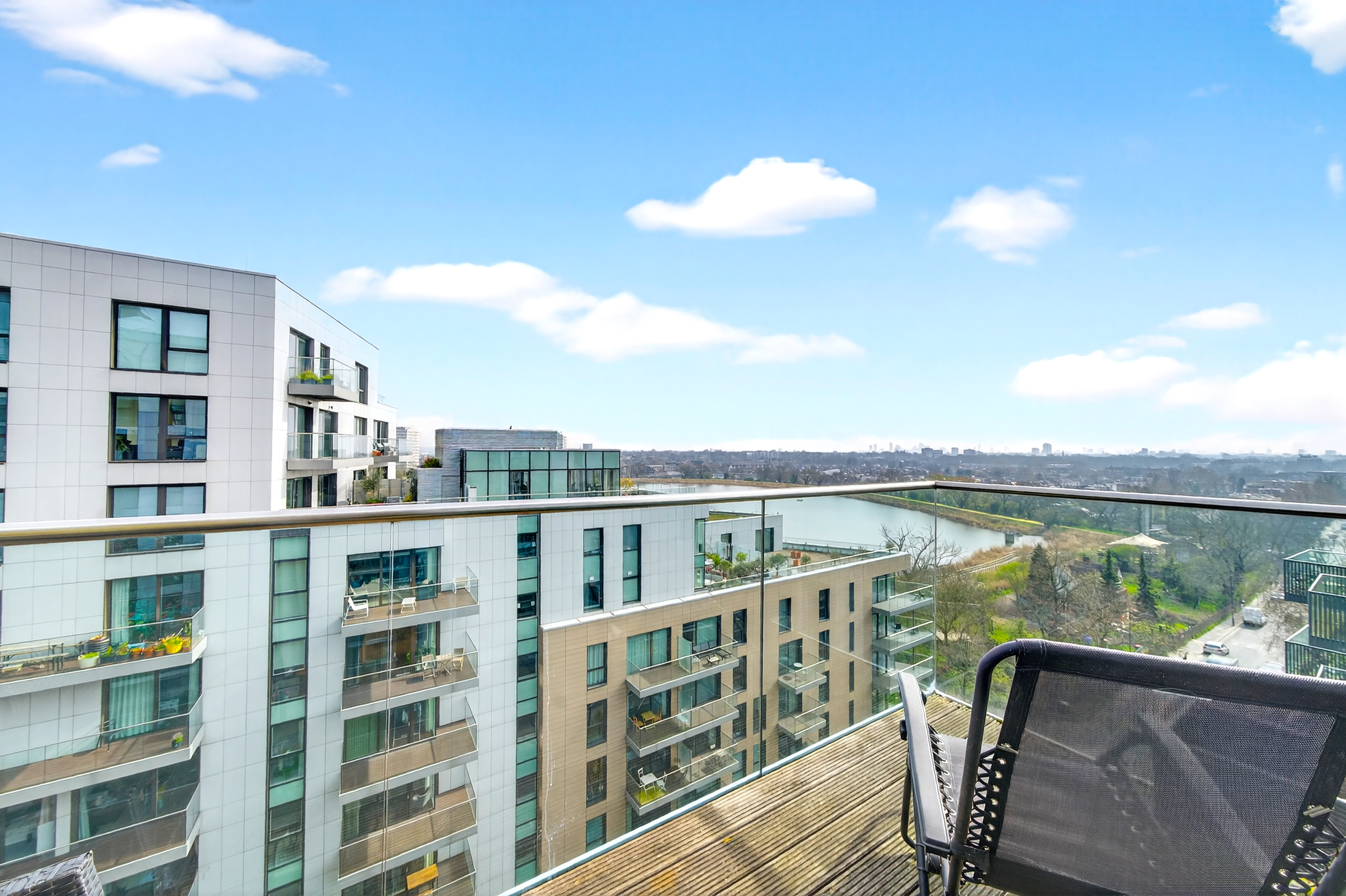 Flat 80 is not just a flat - it's a home. It has had one owner since being built in 2012 . The balcony has beautiful views over a reservoir and on its first day you could see the fireworks from the Olympics. Since then, it has been a place full of fun and laughter whilst also being a quiet oasis from the hustle and bustle of London. Being at the top of its block on the 8th floor with no neighbours above leaves the balcony open to the air and sunshine.