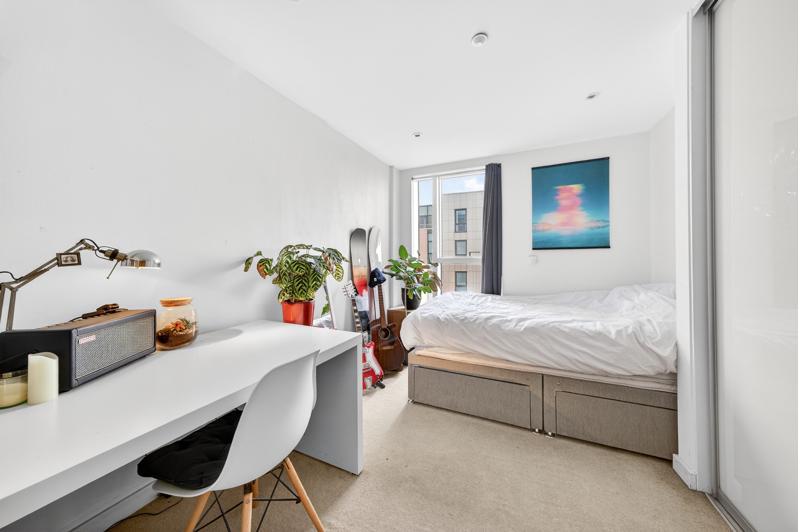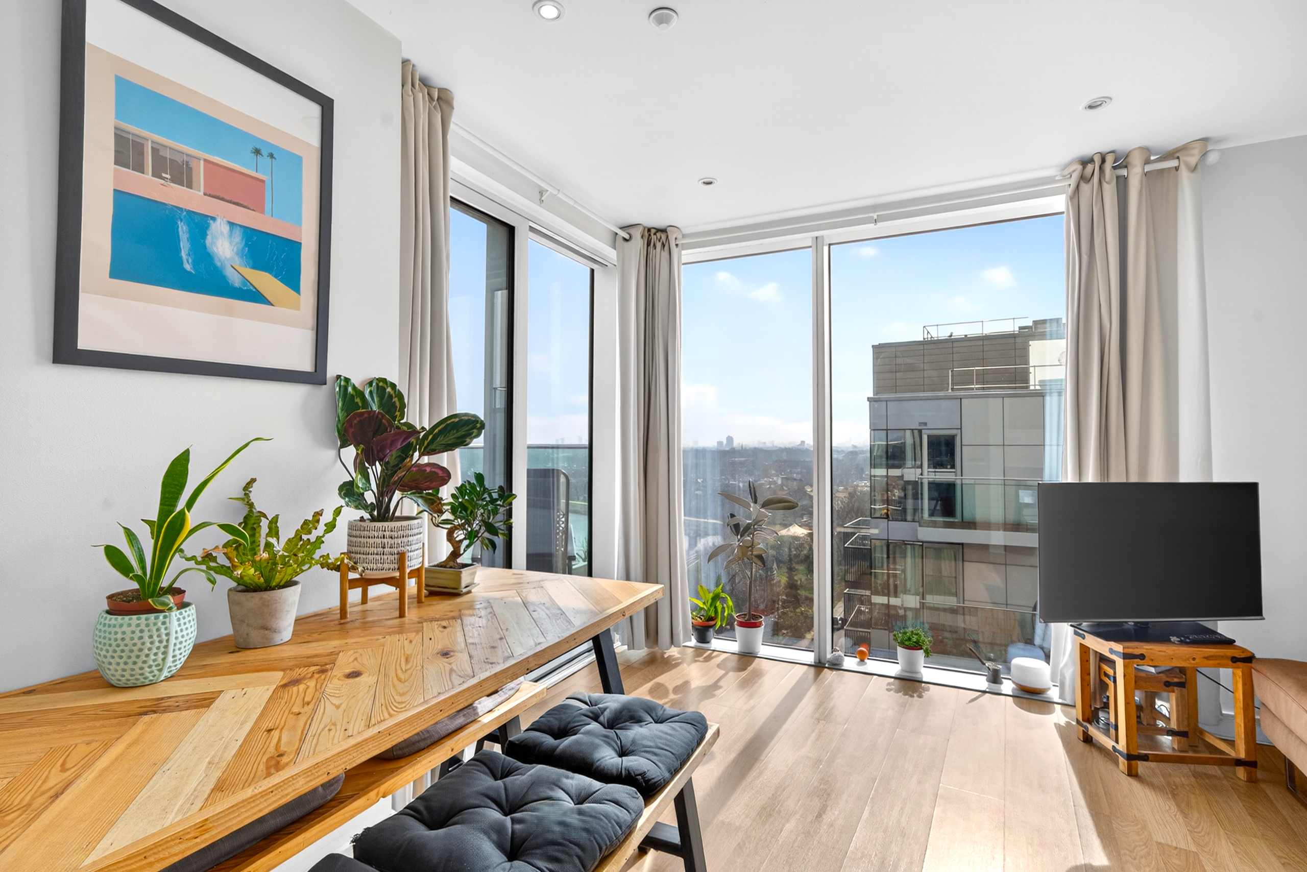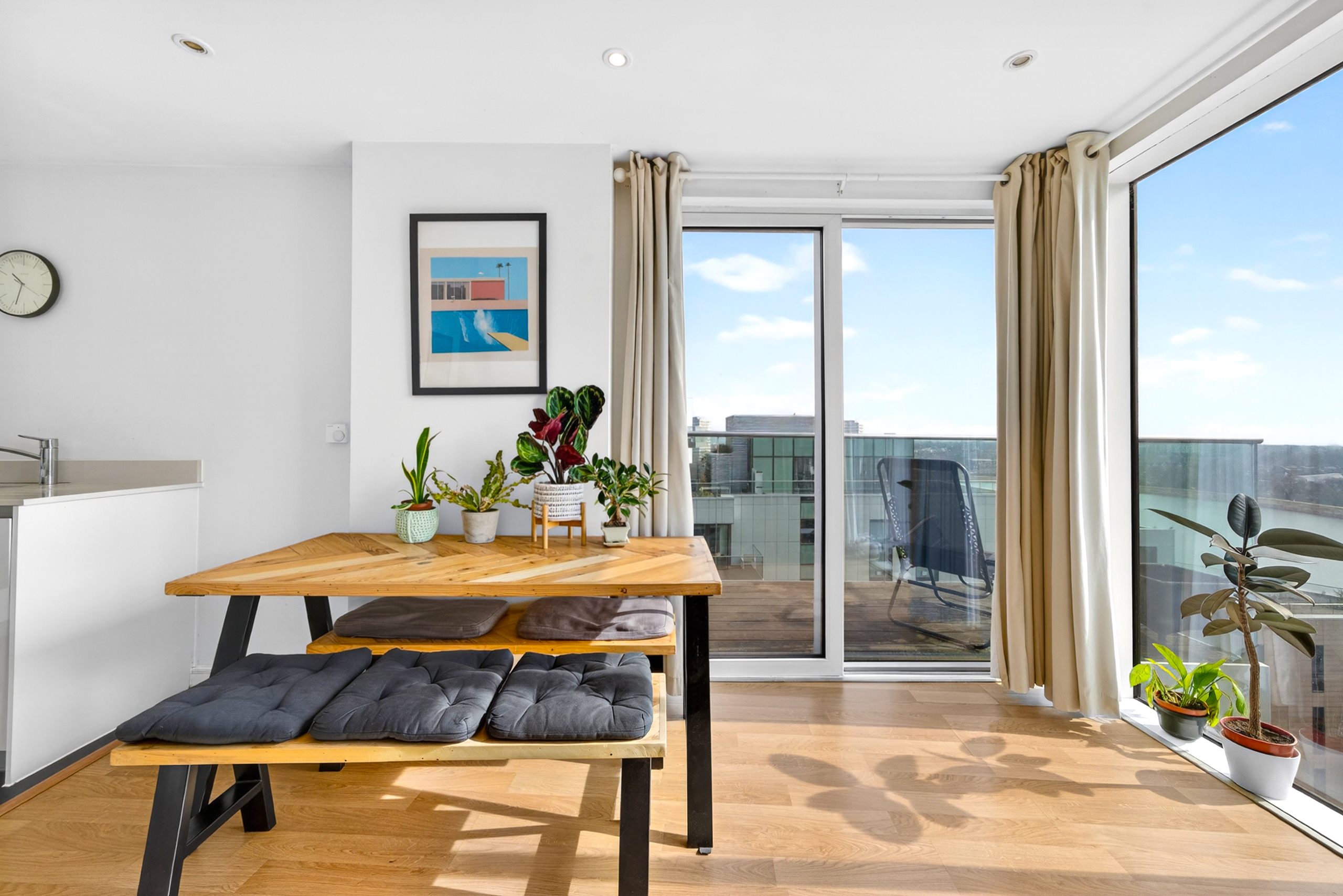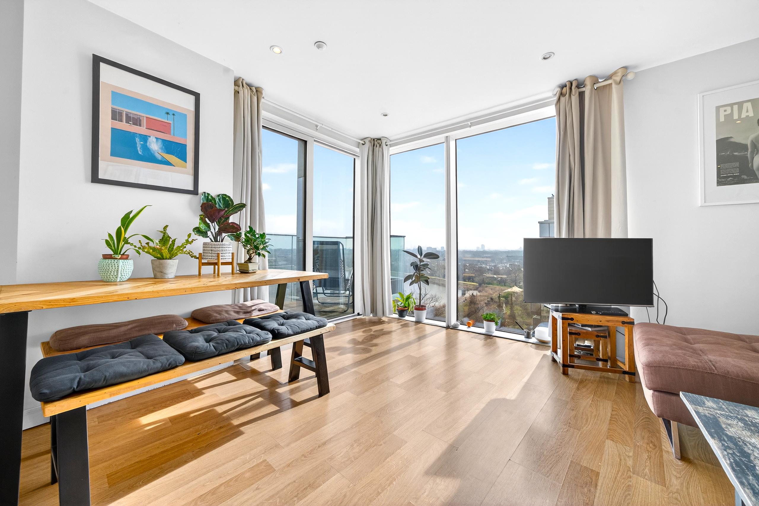Flat 80 is not just a flat - it's a home. It has had one owner since being built in 2012 . The balcony has beautiful views over a reservoir and on its first day you could see the fireworks from the Olympics. Since then, it has been a place full of fun and laughter whilst also being a quiet oasis from the hustle and bustle of London. Being at the top of its block on the 8th floor with no neighbours above leaves the balcony open to the air and sunshine.