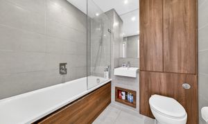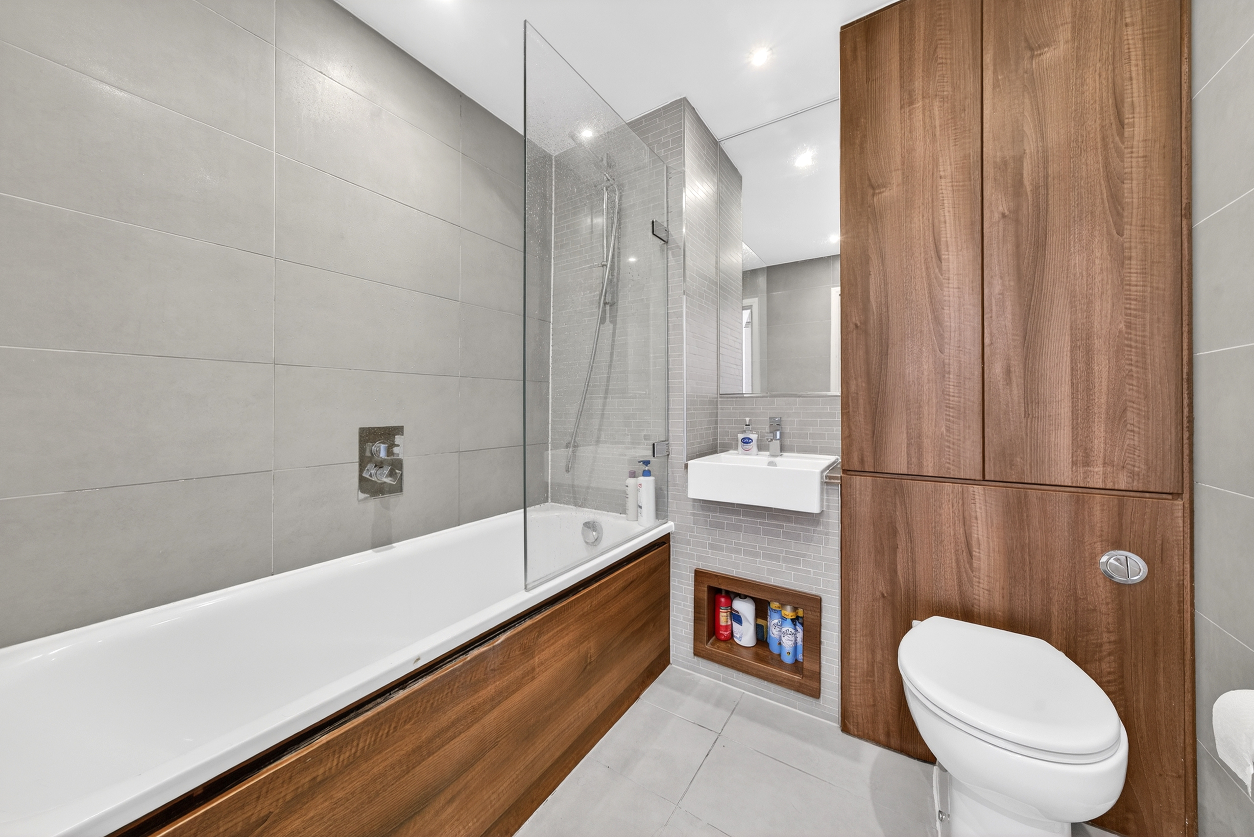 The family bathroom is well-proportioned for the size of the property and has built-in storage and a full-length bath.