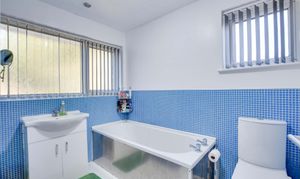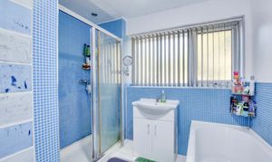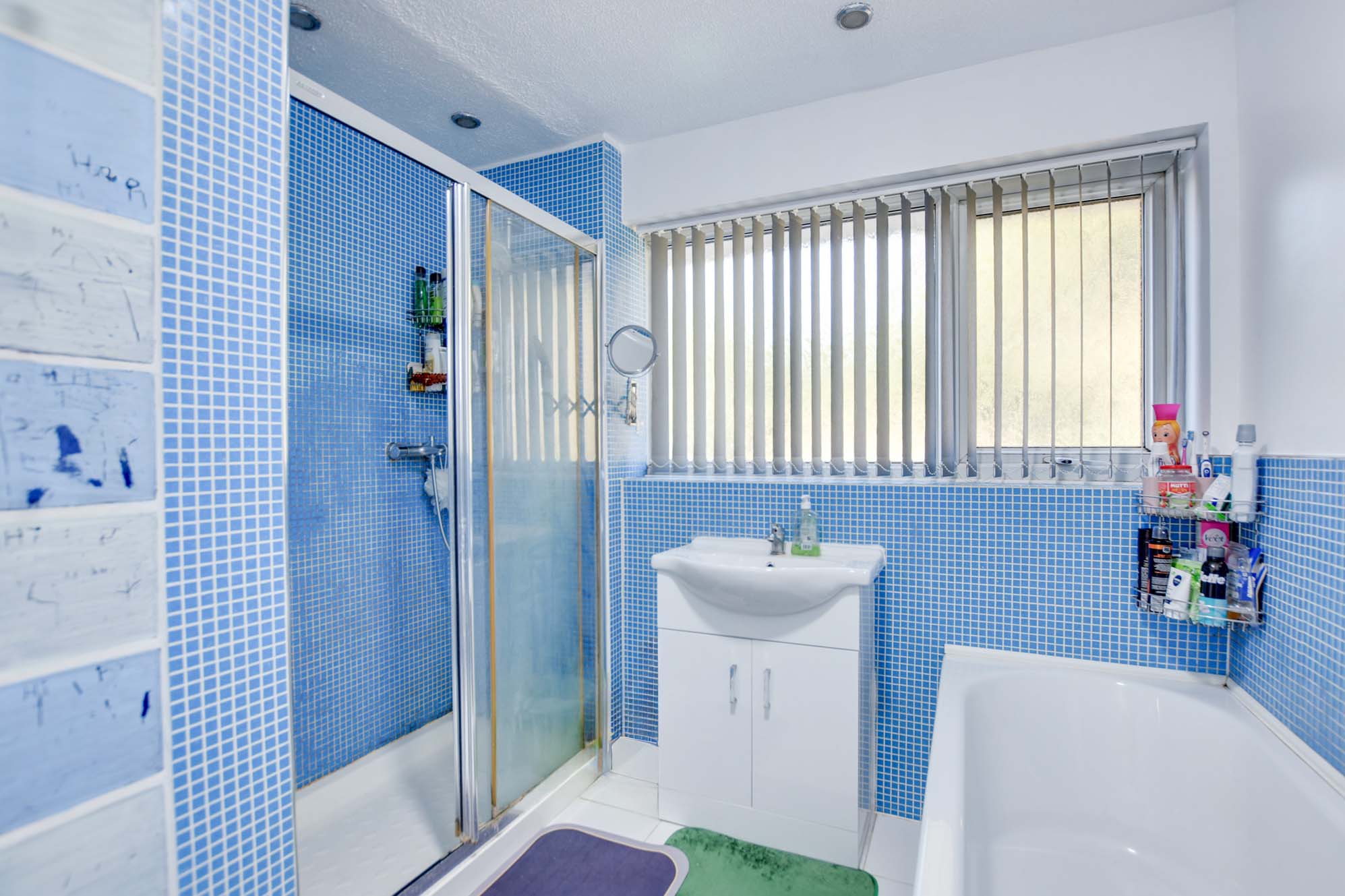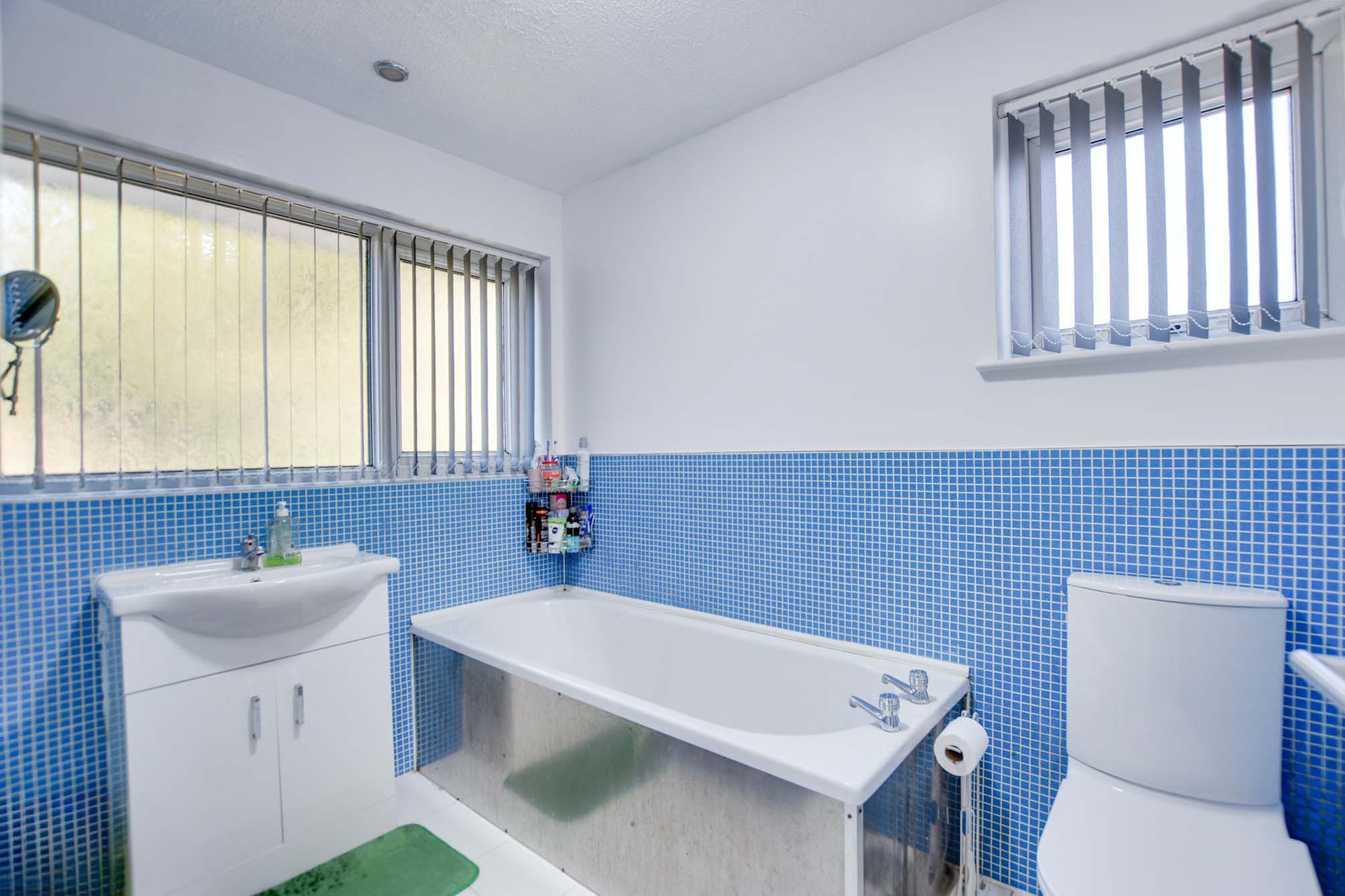 A family bathroom with double glazed windows to the rear and side elevations, bath, separate shower cubicle, wash hand basin, low-level WC, tiled flooring and a heated chrome ladder towel rail.