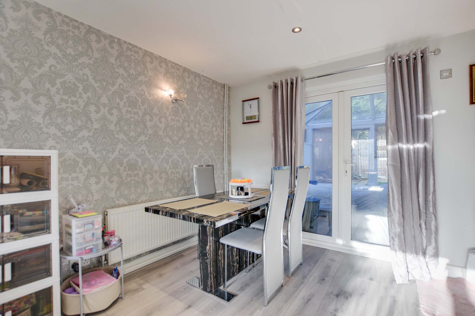This four-bedroom home is available with no upward chain and offers a versatile layout arranged over two floors, making it ideal for buyers needing both ground and first-floor bedroom options. The entrance porch leads into a generous lounge dining room featuring inset ceiling spotlights, two radiators and access to the first floor.
