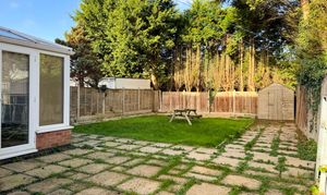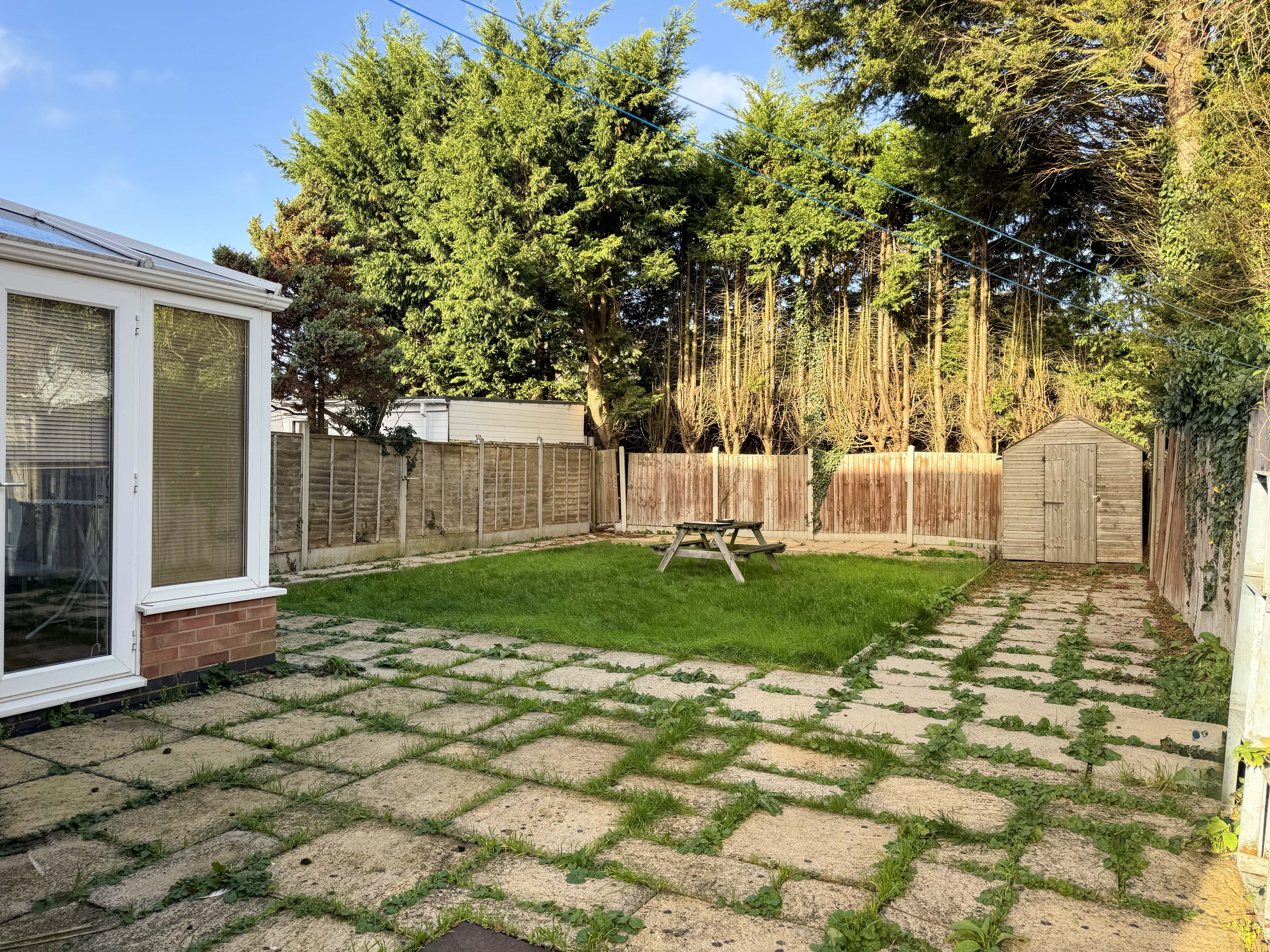 Includes a paved patio area to the rear and side, a lawn, fenced boundaries, a shed and side access.