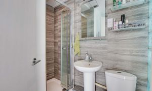 Fitted with a tiled shower cubicle, wash hand basin, low-level WC, tiled floor, inset ceiling spotlights, extractor fan and a double glazed window.